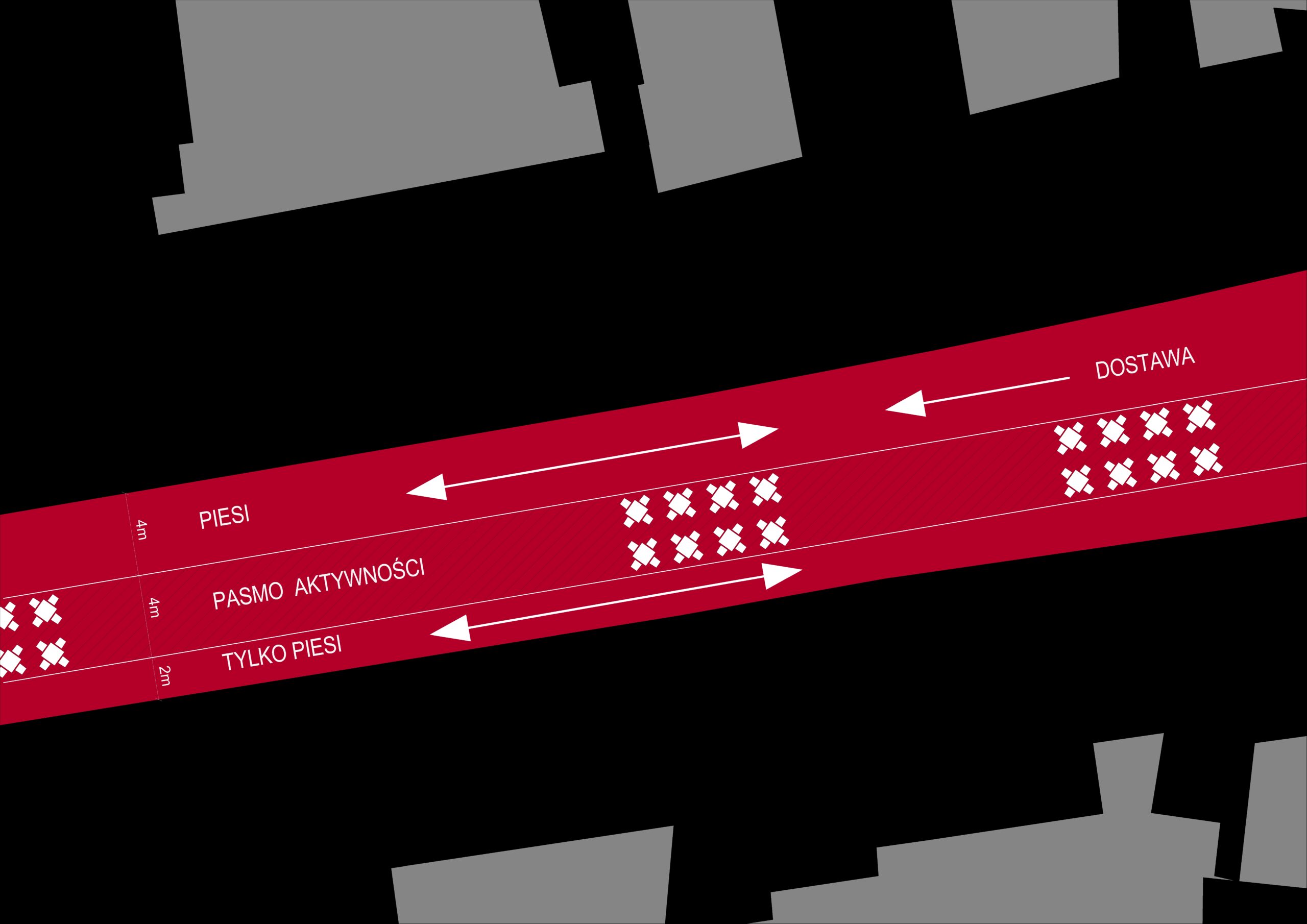 The first one, 4m wide, is a pedestrian route with an occasional unidirectional movement of delivery vans, municipal services vehicles and rescue vehicles. The central band, also 4-meter wide, is the so-called activity zone. At this place, summer gardens for catering establishments on both sides of the promenade are to be built. Here are organized events and events, such as fairs, occasional exhibitions, etc., aimed at attracting as many people as possible to the promenade. The southern band with a width of 2 m is intended only for pedestrians. The division into strips is to be visible in the drawing of the floor.