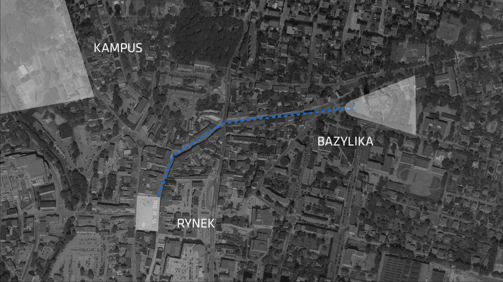 Halfway between the square of the passage and the basilica, narrowing the street Powstańców does not allow the separation of a wide enough activity belt. This place is to be used for the needs of an experiment spread over many years.