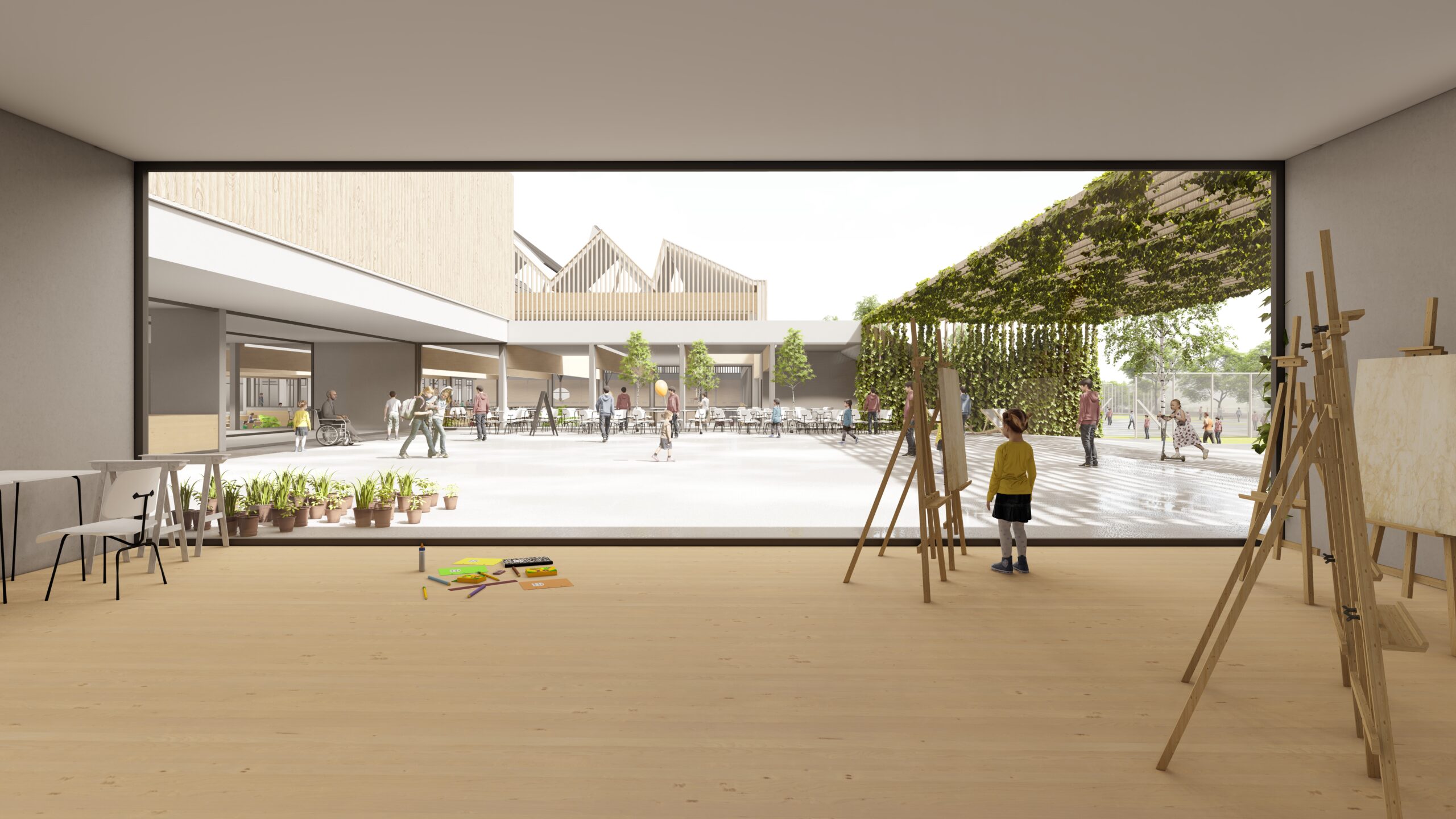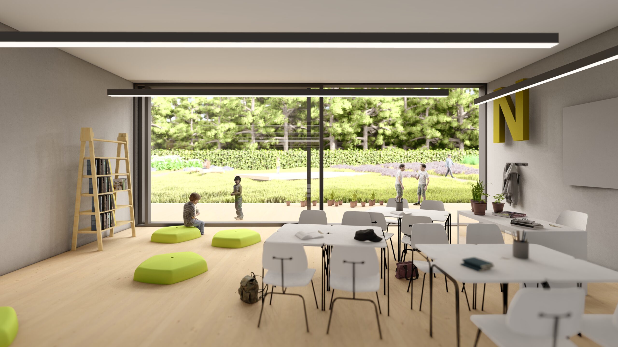 THE DAYLIGHT SCHOOL OF SOFT LIGHT reconciles optimal lighting conditions conducive to concentration and limiting students’ fatigue with a friendly interior microclimate obtained with low energy consumption. The school ensures the proper development of the child, which promotes individual creativity and at the same time builds social relations between different age groups and the entire LOŠBATES community. Despite the large cubature of the building significantly exceeding all the sites in the area, the building is part of the landscape because from most directions it can be perceived as a complex of ground floor buildings.