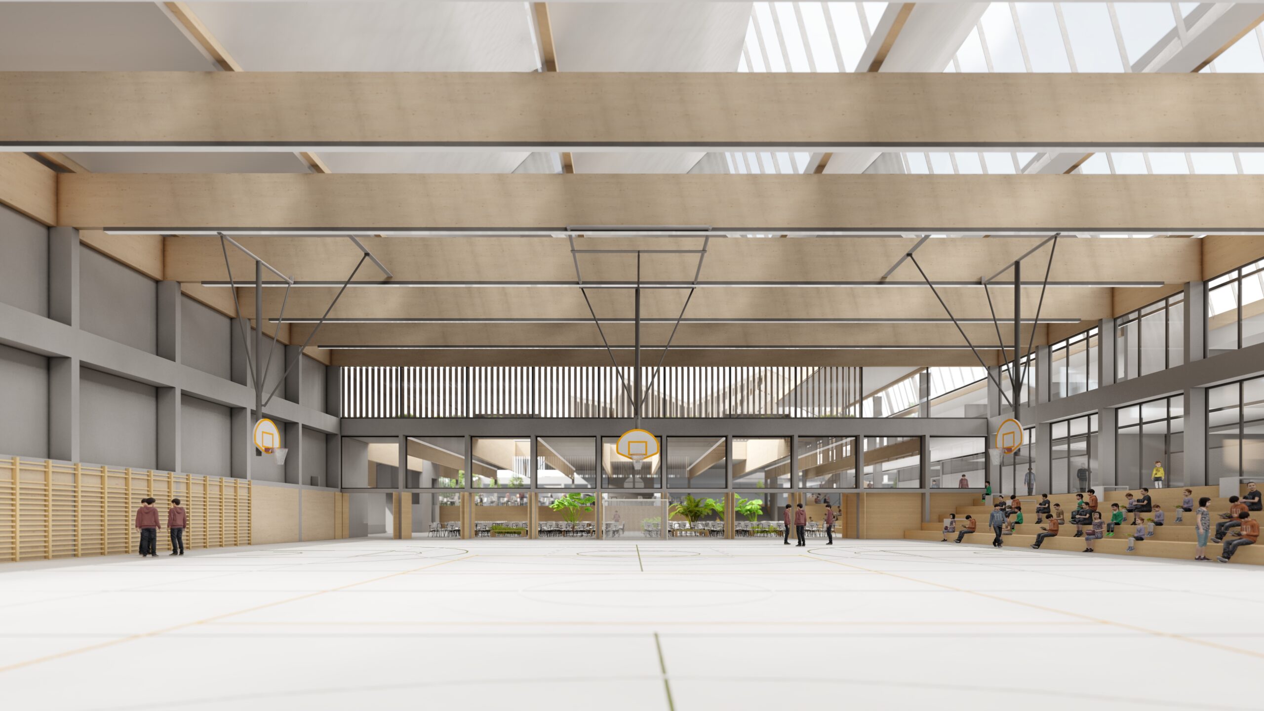 The general lighting to the gymnasium is provided by diffused daylight from the north-facing clearstories in a sawtooth roof and if required due to the time of the day or season, supplemented by mean of artificial lighting (ball proof LED linear lighting with diffuser positioned underneath the structural beams). The LED luminaires are activated and slowly and gradually made brighter only when the available daylight is not sufficient. This system will maintain a constant level of lighting. Standard illuminance requirements vary according to the sports type (football, handball, basketball and other collective sports).