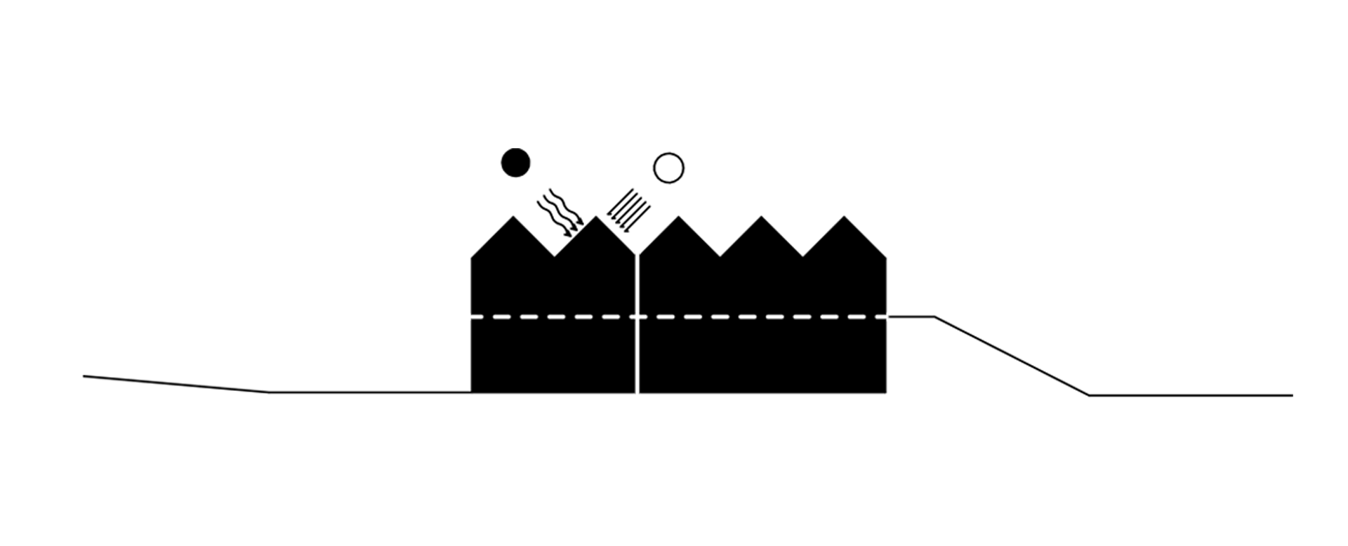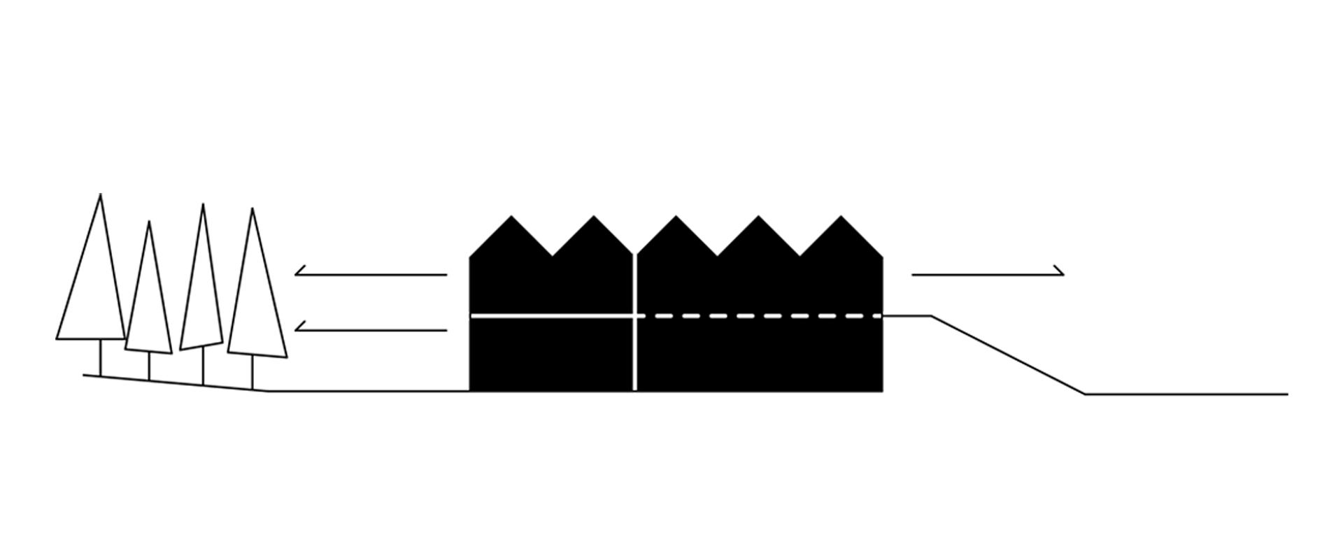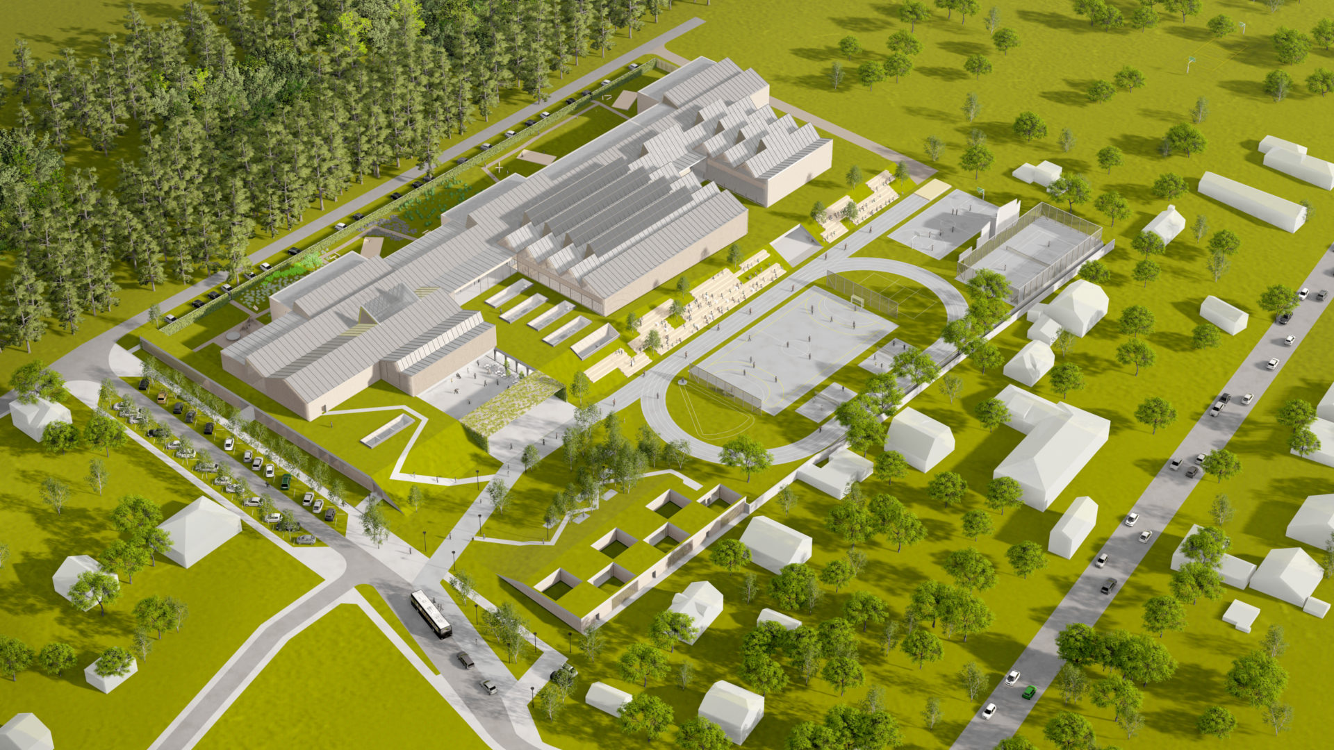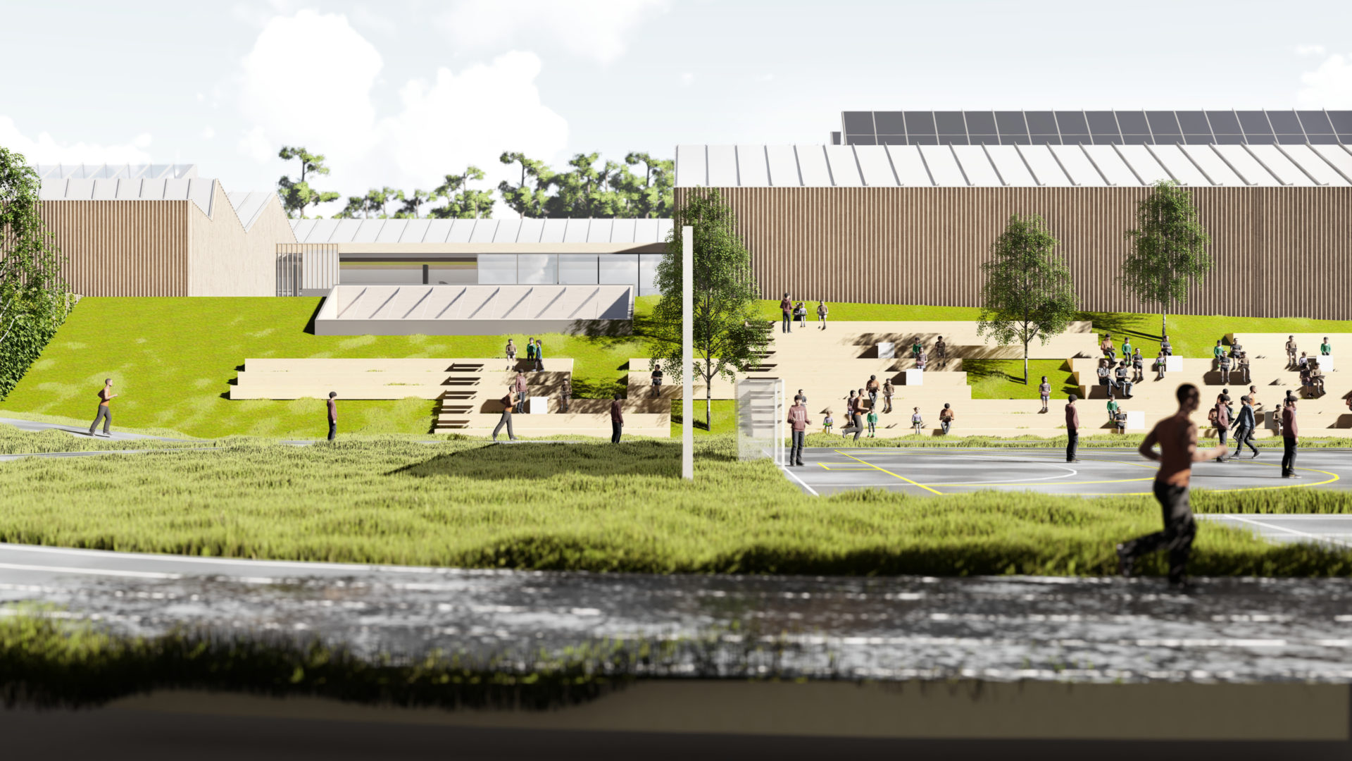 On the south side, there is an “entrance park” and sports grounds. The surface of the ground is raised gently to the level of the second floor. High school students can go directly to a green recreation area with a closed, distant view of Louňovice and ecological areas behind KutnoHorska. On slopes leading towards the pitches and treadmill, sitting benches are to be implemented. This terrain allows students of both levels to have direct access to green recreational areas. At the same time, raising the ground from the south limits, optically, the height of the building to one storey, creating a “village on the hill”.