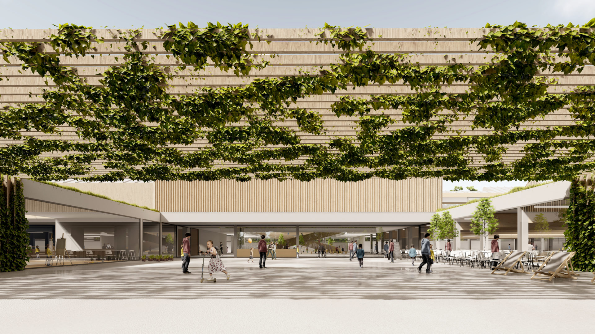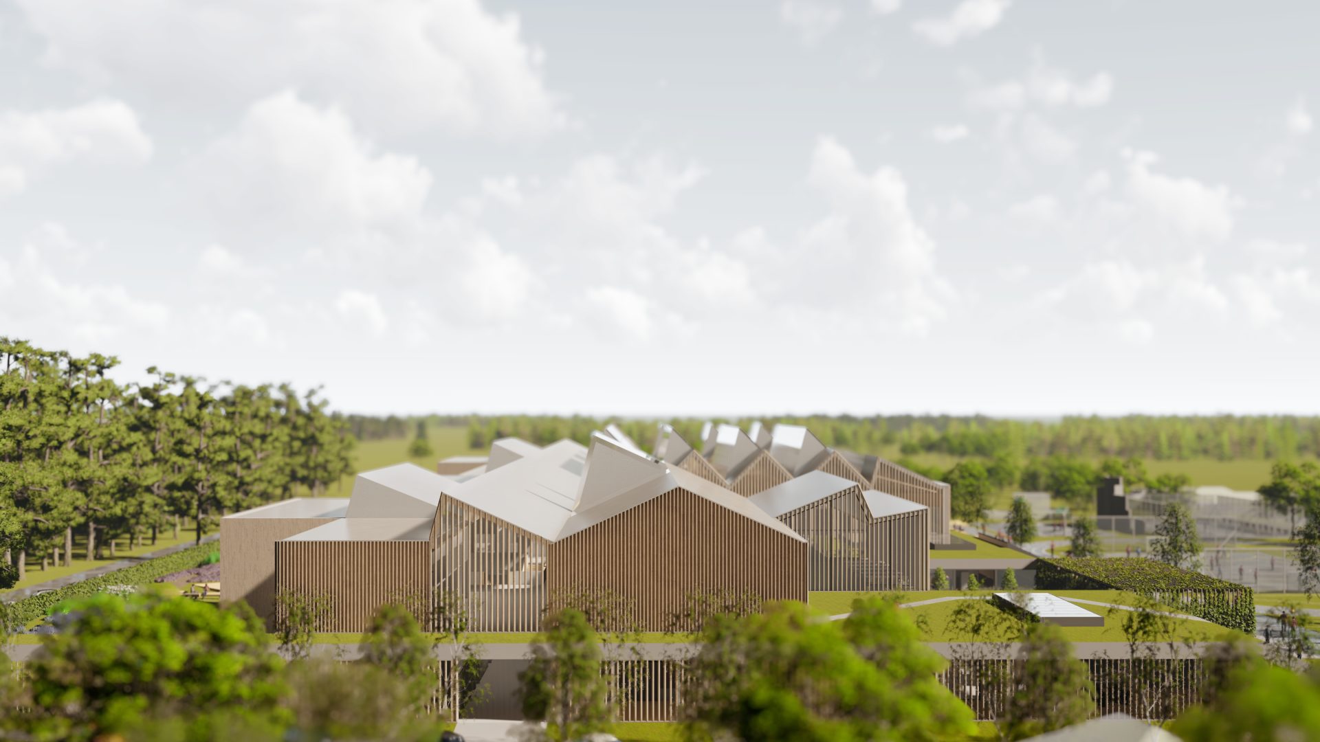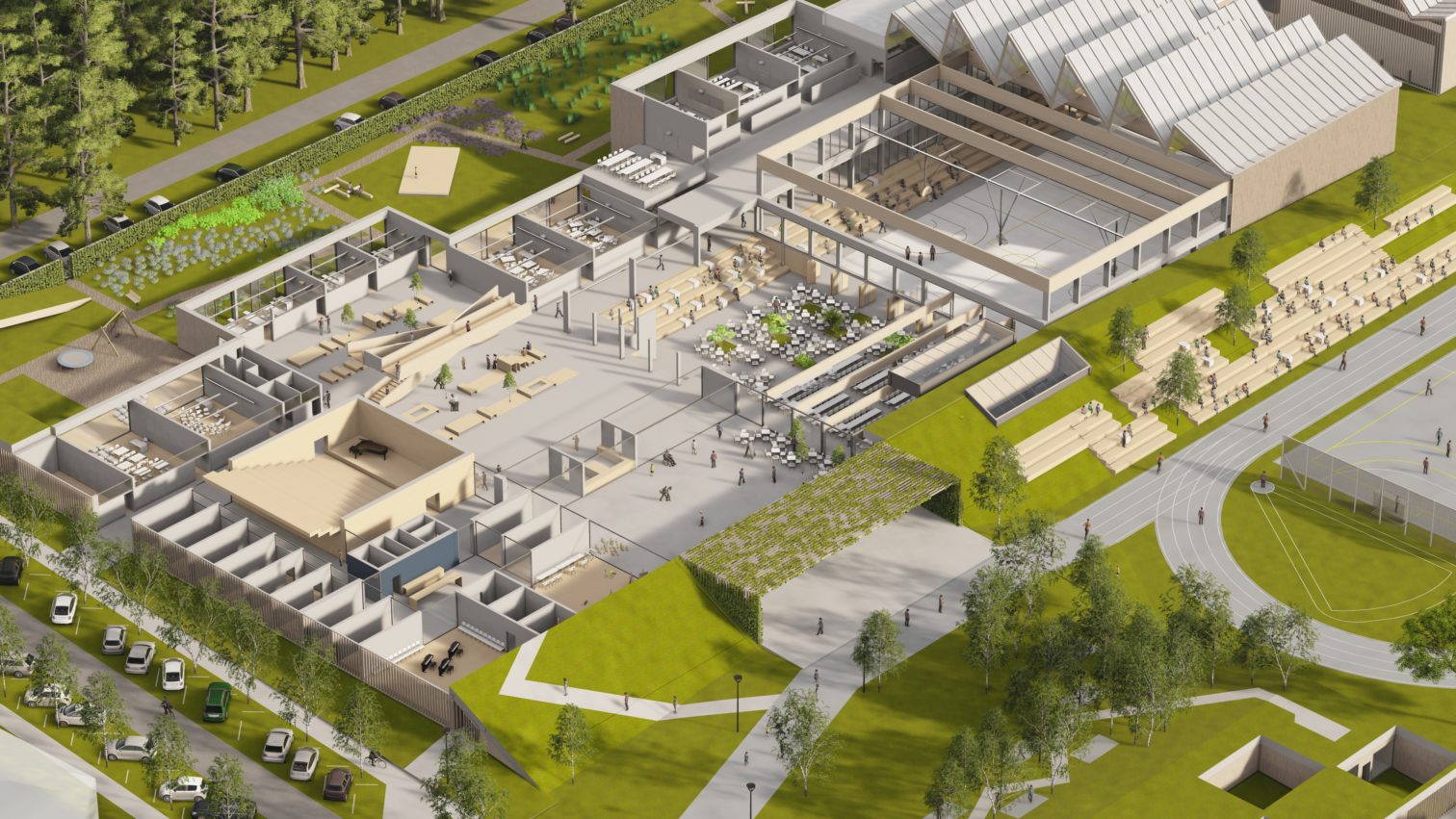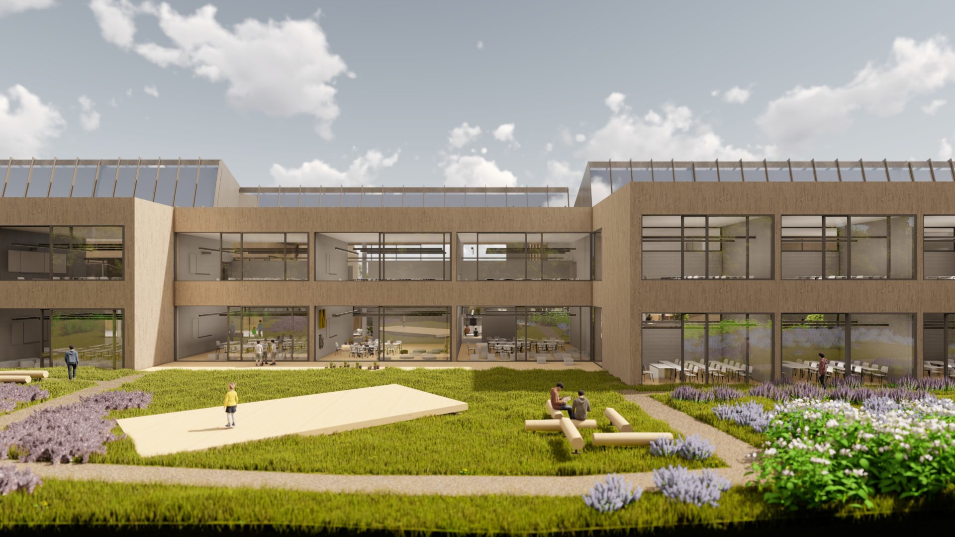 On the south side, there is an “entrance park” and sports grounds. The surface of the ground is raised gently to the level of the second floor. High school students can go directly to a green recreation area with a closed, distant view of Louňovice and ecological areas behind KutnoHorska. On slopes leading towards the pitches and treadmill, sitting benches are to be implemented. This terrain allows students of both levels to have direct access to green recreational areas. At the same time, raising the ground from the south limits, optically, the height of the building to one storey, creating a “village on the hill”.