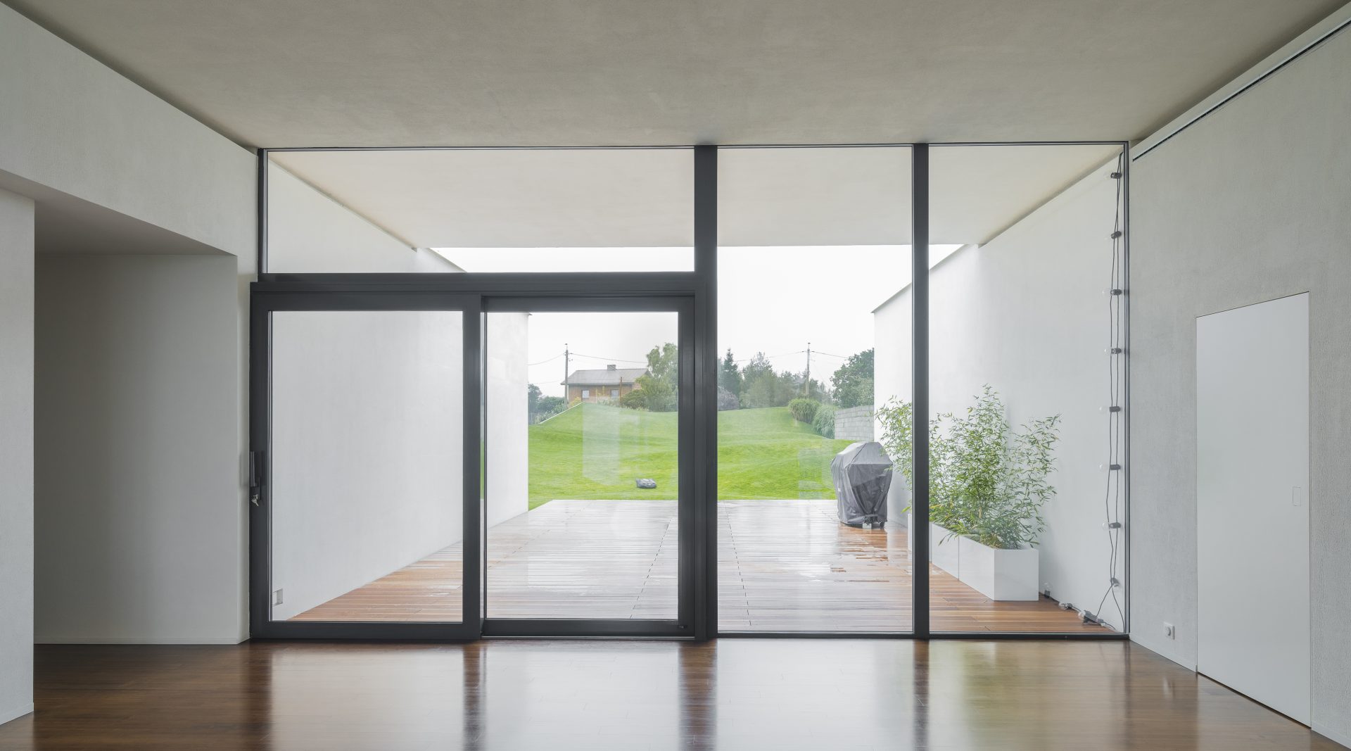 The house consists of four main walls which act as an acoustic barrier. All main functions of the house are located in between these walls. The walls and roof are moved beyond the glazing which gives two major advantages viz. it limits the noise from the motorway and protects the interior spaces from the summer sun and winter sun.