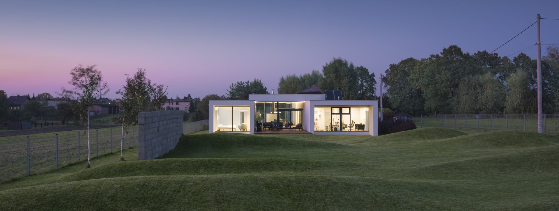 The entrance court is closed with heavy wooden gates. One of the aspects of the project is the lawn which is not flat but sculpted in form of ripples almost representing a lake or a sea. This allows for the shadow play during the daytime making the lawn appear as moving waves.