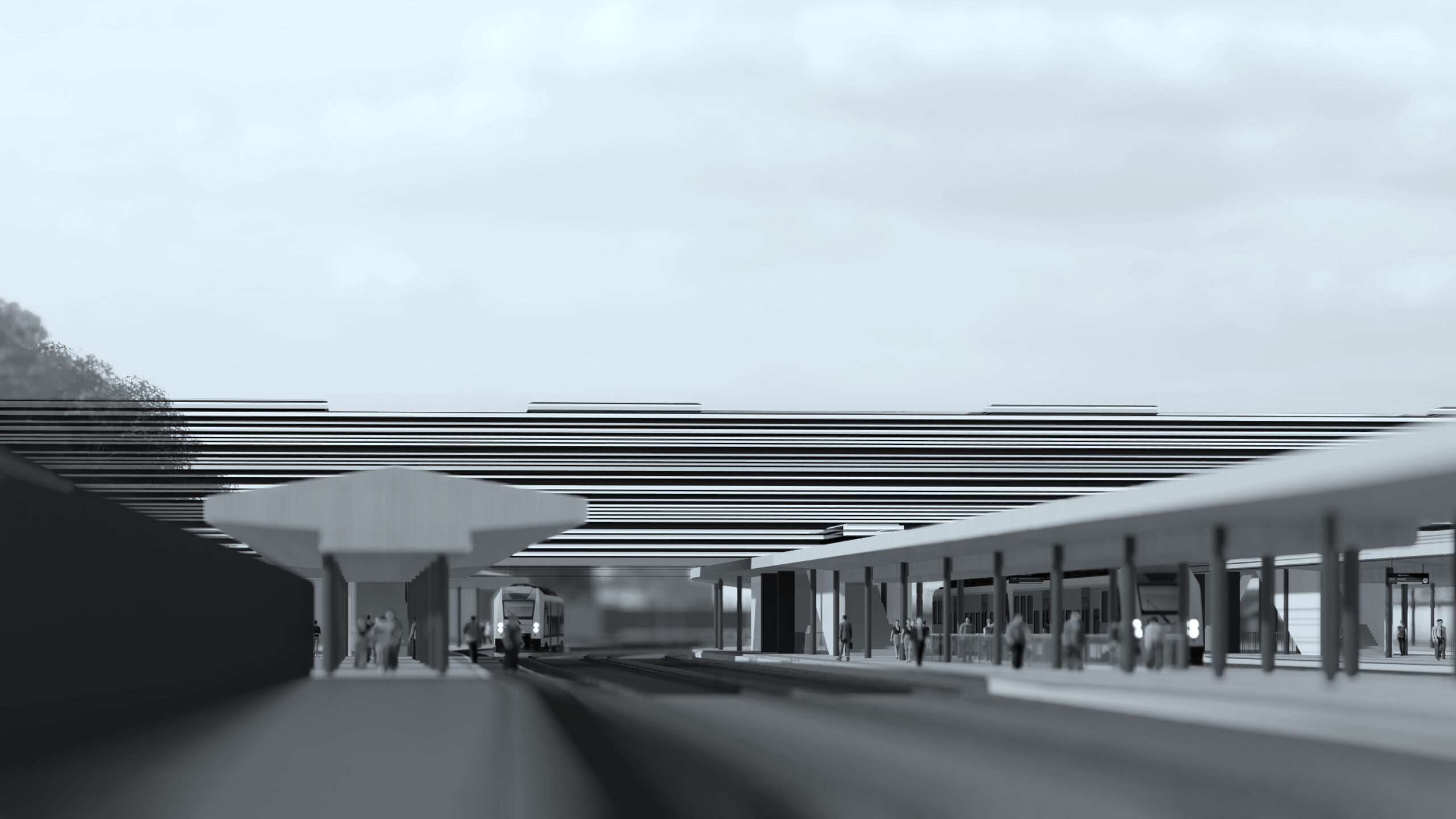The station’s program here is limited to ticket vending machines, ATMs, information and toilets on the ground floor and waiting room with a point for serving drinks and sanitary facilities. Communication between levels is facilitated by escalator and elevator. Additional elevators allowing for the disabled access to internal platforms are designed on the intersection of the arcade and stairs.
