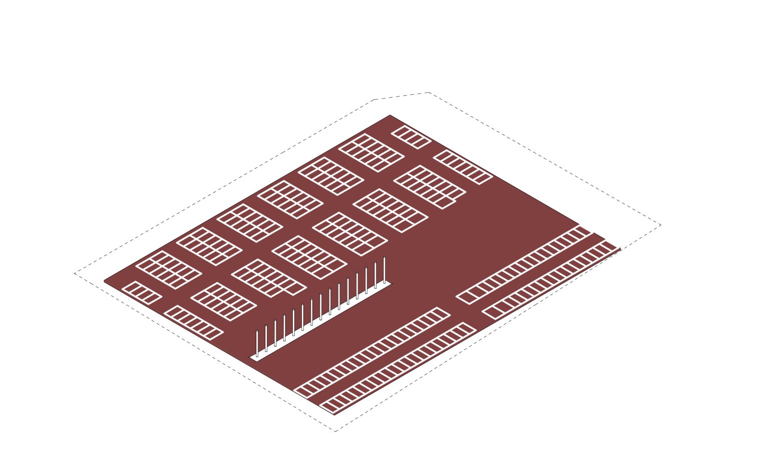 Strukturę obiektu tworzy siedem naw o jednakowej szerokości, rozmieszczonych wzdłuż osi północ-południe. Z wyjątkiem jednokondygnacyjnej nawy środkowej wszystkie nawy mają po trzy kondygnacje. Dolna kondygnacja stanowi bryłę parkingu. Trzy nawy wschodnie tworzą Zespół Urzędów Powiatowych, podczas gdy nieco dłuższe nawy zachodnie formują bryłę Starostwa nadwieszoną nad placem wejściowym i zamykającą go od strony zachodniej. Na dachu parterowej nawy środkowej zaprojektowano ogród dostępny z obu instytucji. Projekt zachowuje szpaler dorodnych olch na działce. Odnosząc się do ich kierunku, gęstości i gatunków drzew, uformowane zostały dwa nowe szpalery, które zacieniają plac wejściowy i zewnętrzny parking, a także osłaniają zespół od ruchliwej ulicy Marii Skłodowskiej-Curie.