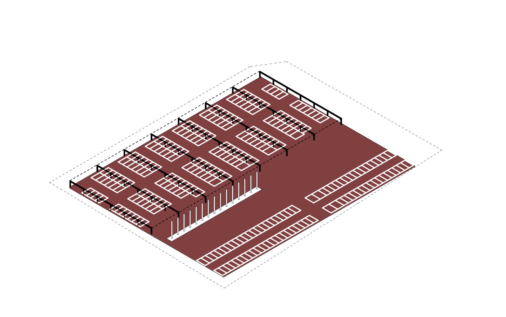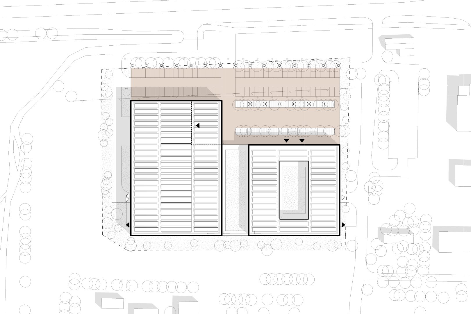 Strategiczna decyzja o lokalizacji parkingów dla samochodów osobowych wynikała z wymogów konkursu, który zakładał stworzenie 250 miejsc postojowych. Próba umiejscowienia ich na poziomie terenu spowodowałaby zajęcie znaczącej części działki. Ze względu na wysoki poziom wód gruntowych zrezygnowano z budowy parkingu podziemnego, a realizację parkingu wielopoziomowego uznano za nieuzasadnioną ekonomicznie i przestrzennie. Większość miejsc parkingowych zlokalizowano pod budynkiem, a pozostałe poza nieprzekraczalną linią zabudowy. Parking jest przewietrzany naturalnie z kierunku wschód-zachód. Ze względu na obowiązujące odległości od granicy działki, ściana parkingu od strony południowej pełni funkcję bariery akustycznej.