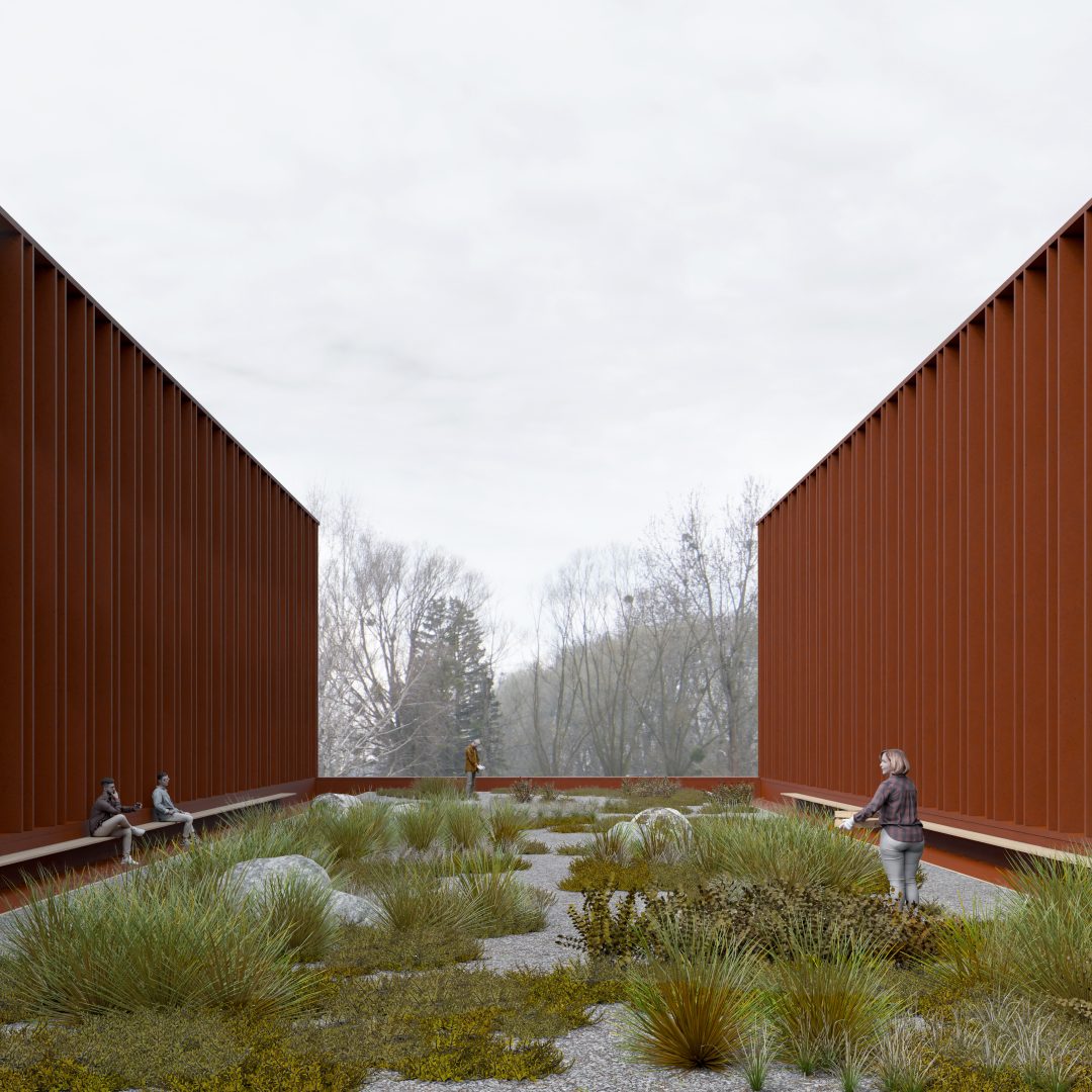 publiczne: otwarte i zamknięte. Projekt Starostwa w Toruniu proponuje całą gamę takich rozwiązań. Zacieniony plac wejściowy wyposażony jest w stałe pomosty do siedzenia oraz przestawialne krzesła i stoliki. Ogród sensoryczny ma zapewnić wytchnienie, oddziałując na zmysły korzystających z niego osób.
