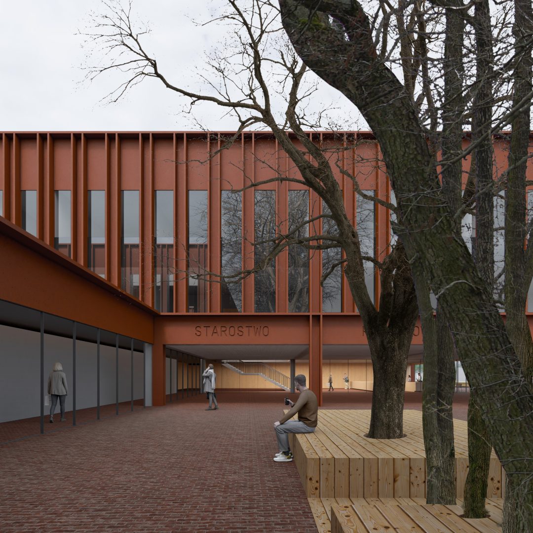 Plac wejściowy jest zacieniany przez szpalery olch. Drzewa w części utwardzonej placu otoczone są liniami ażurowych drewnianych pomostów do siedzenia, a woda z ceglanej powierzchni jest odprowadzana w kierunku korzeni. Plac przechodzi w podcień prowadzący do holu wejściowego Starostwa, w którym zlokalizowano biuro obsługi interesanta. Dolny hol zawiera również bufet z możliwością wystawienia stolików w cieplejsze miesiące na zewnątrz do podcienia.