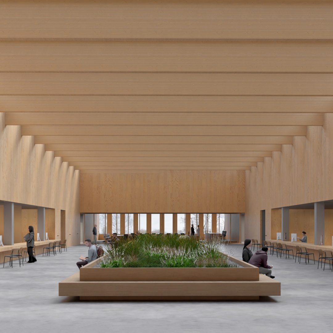 Konstrukcja przykrycia dwukondygnacyjnej sali operacyjnej i sali rady wykonana została z drewna klejonego, a na ścianach zastosowano panele akustyczne z jasnego drewna. Wnętrza te, mimo znacznej skali, mają być ciepłe i przytulne, a akustyka wygłuszona. Wnętrza ociepla również naturalna zieleń w centralnej części hali operacyjnej. Sala rady jest otwarta zarówno na widok z hali operacyjnej, jak