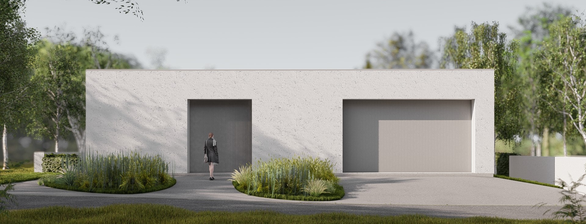 Bryłę sperforowaliśmy trzema atriami. Średnie-wejściowe stanowi śluzę odgradzającą dom od drogi. Duże – środkowe to serce domu, przedłużenie pokoju dziennego, miejsce do którego można się dostać łatwo z każdego pomieszczenia w domu. Wreszcie małe, z widokiem na ogród, całkowicie przynależne do sypialni właścicieli, przeznaczona na poranną kawę w szlafroku lub zwierzenia przyjaciółek. Z widokiem na ogród, bo i ten udało się wygospodarować jednak nie jako przestrzeń użytkową a jedynie obraz do oglądania. Okna wszystkich sypialni zwrócone są w tą stronę i nie mają podziałów co czyni z nich ramy kadrujące widok. Na końcu ogrodu zieleń ma zasłaniać stodołę póki ta sama się nie przewróci. Taka całoroczna fototapeta.