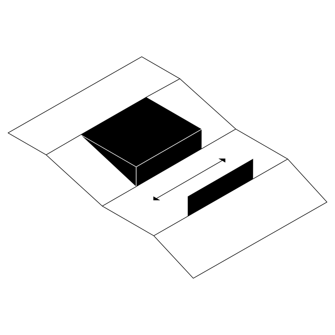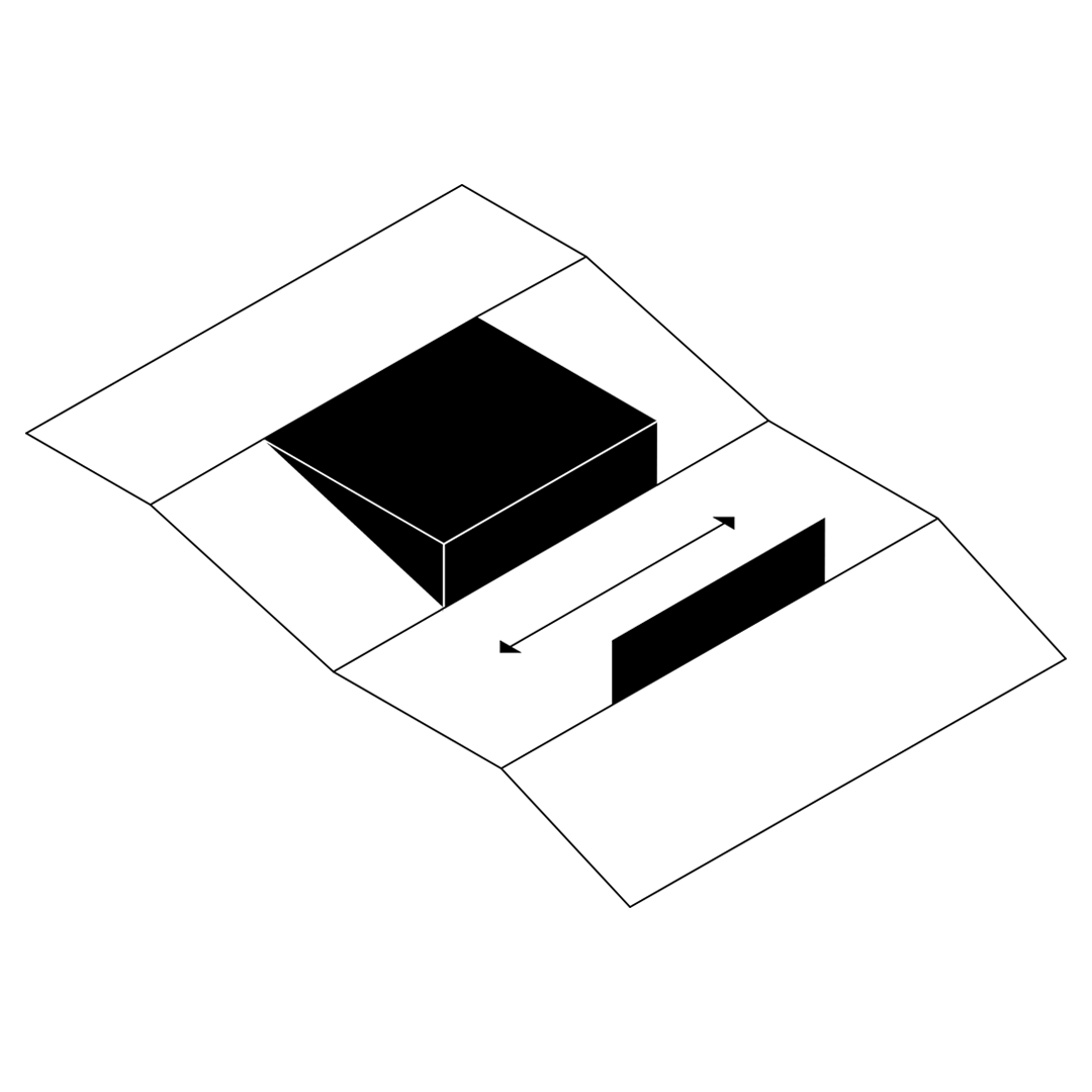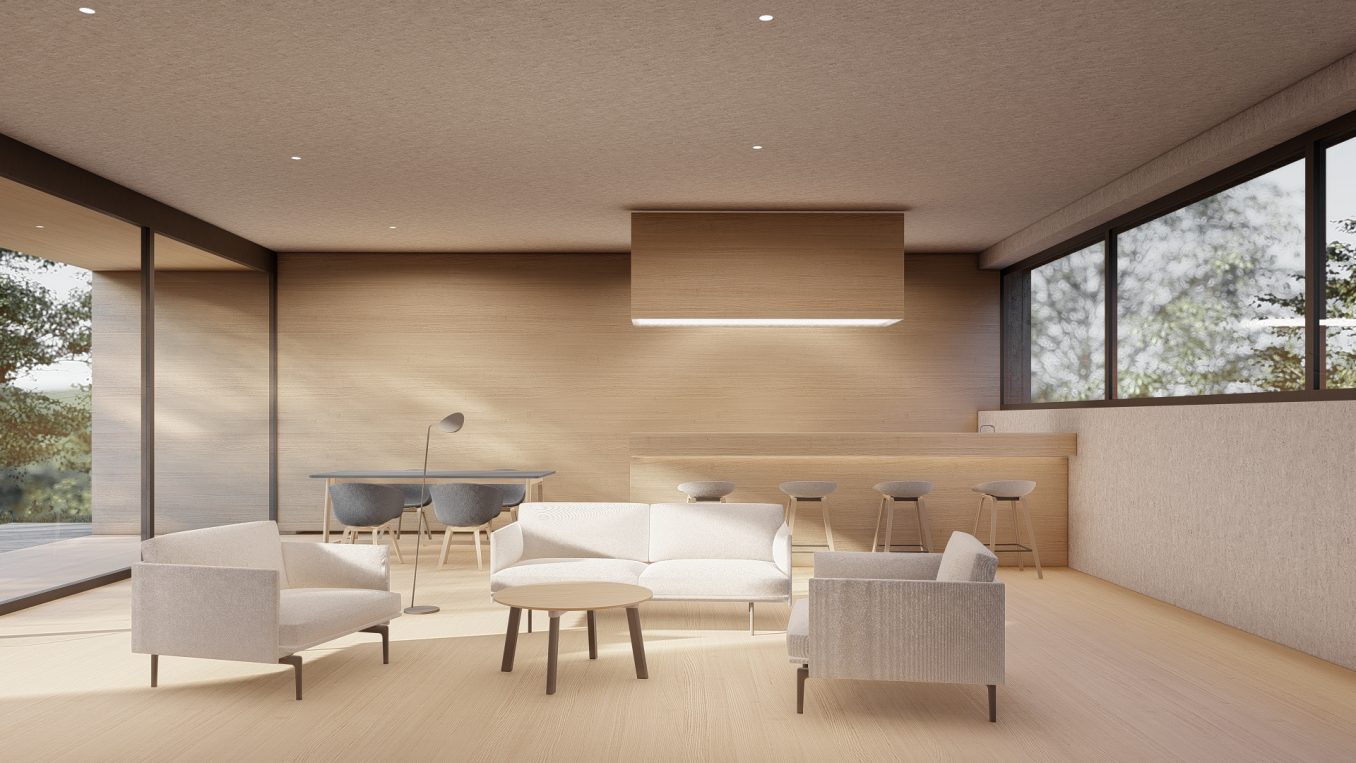 Na koniec dom kształtuje się z czterech kwadratów 9x9m po dwa na kondygnację. Od północy kwadrat garażu i wejścia pod którym kwadrat prawie całkowicie zagłębiony w ziemi mieszczący pomieszczenia techniczne i królestwo pana domu gabinet, siłownia i pomieszczenie odsłuchowe w jednym. Na południe kwadrat sypialni, które wiszą nad w pełni przeszklonym na wschód i zachód pokojem dziennym – czwartym kwadratem. Taras przy pokoju lekko zagłębiony w bryle budynku jest dodatkowo przesłaniany od drogi przez kładkę wejścia mieszczącego się kondygnację wyżej. Pełna intymność.