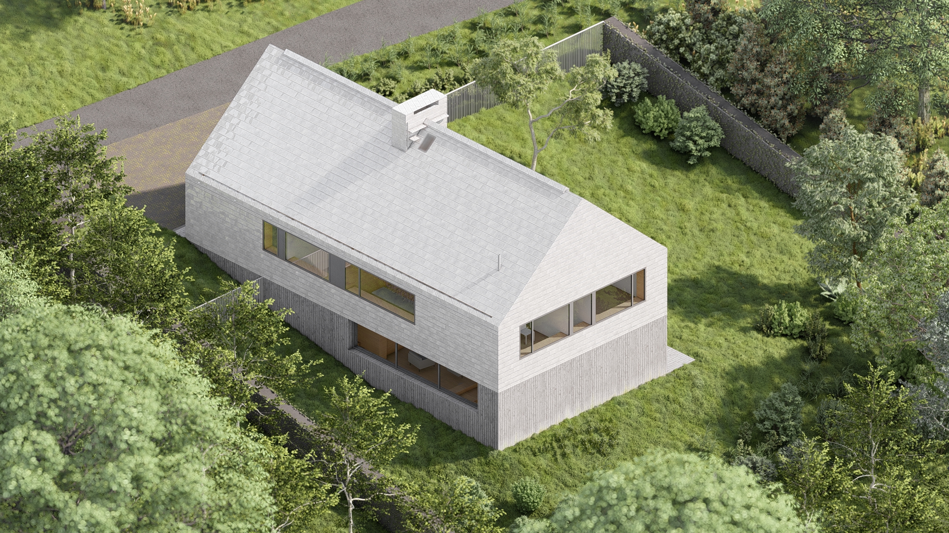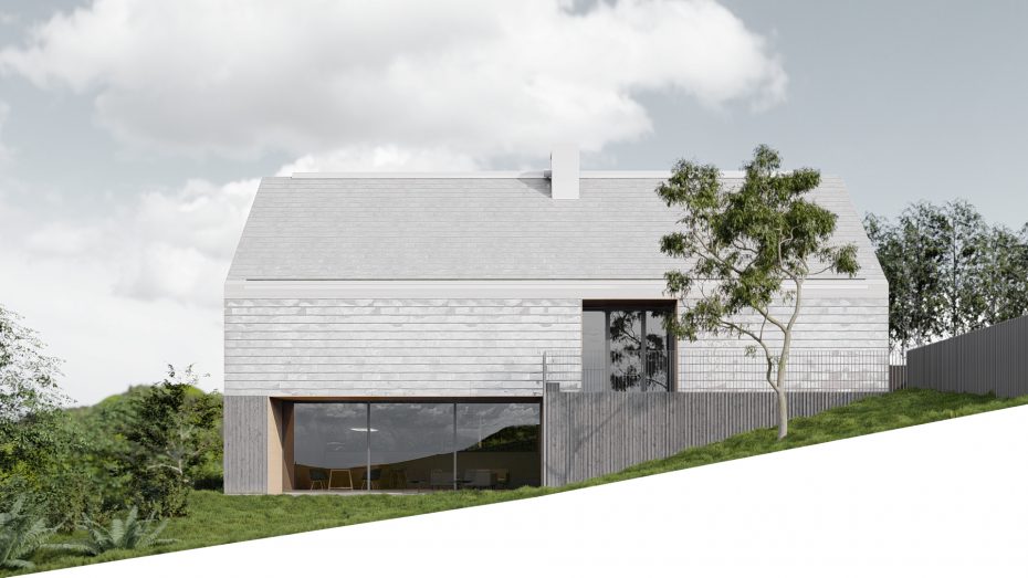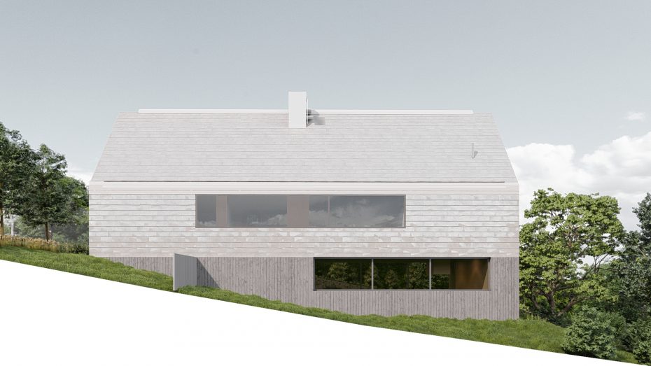 Ponieważ połowa dolnej kondygnacji jest żelbetową skrzynią zagłębioną w gruncie, cały parter zaprojektowany jest z surowego betonu z odciskami deskowania. Beton świetnie uzupełnia naturalne drewno. Górna kondygnacja i dach stanowią jedną bryłę pokrytą blachą tytanowo – cynkową z otworami wykończonymi drewnem. Beton, drewno i metal to zestaw, który dobrze się komponuje i bardzo dobrze starzeje.