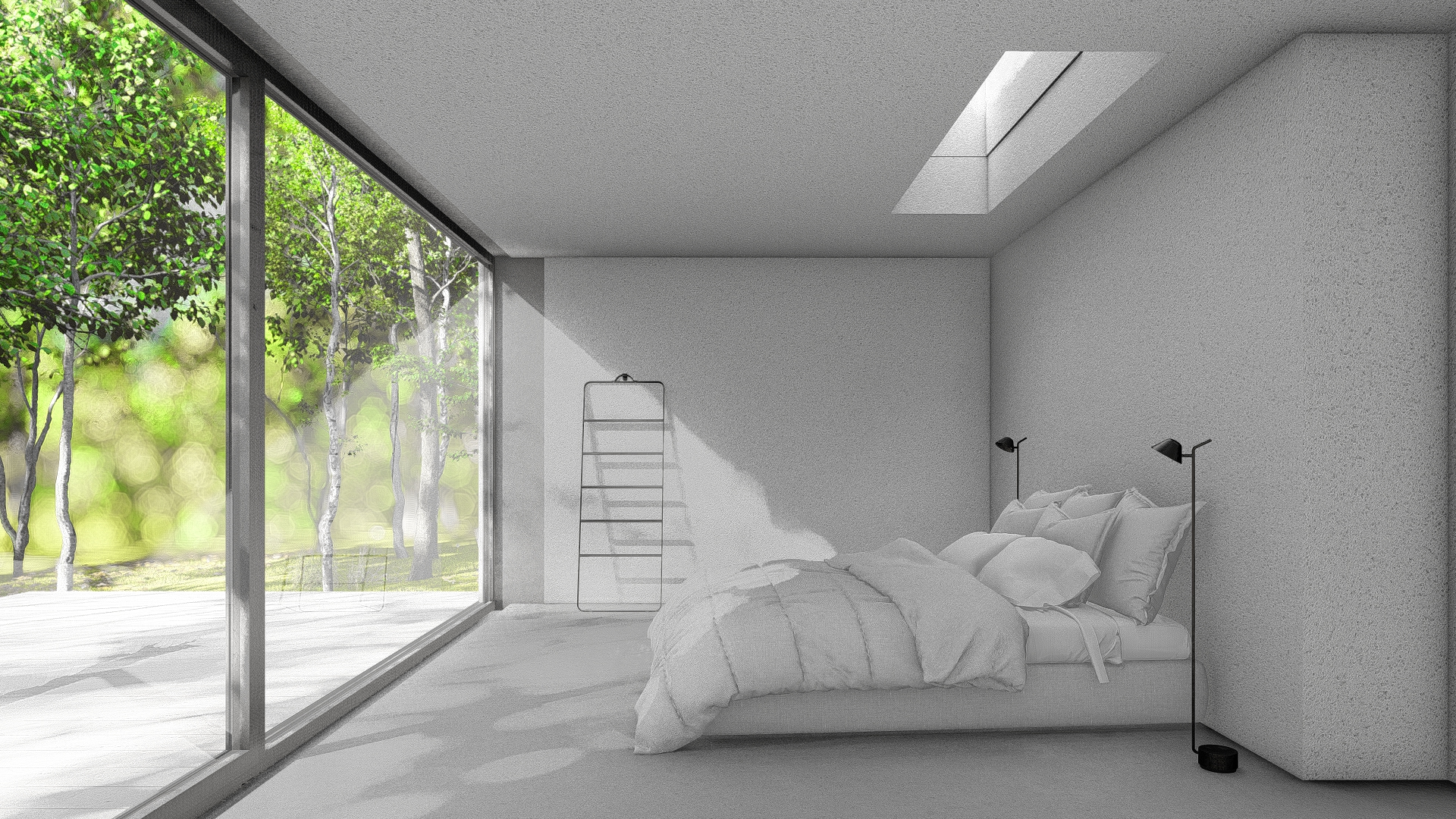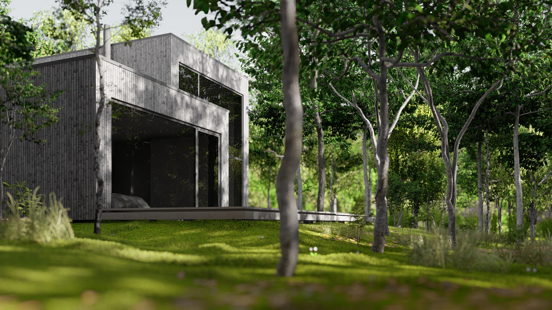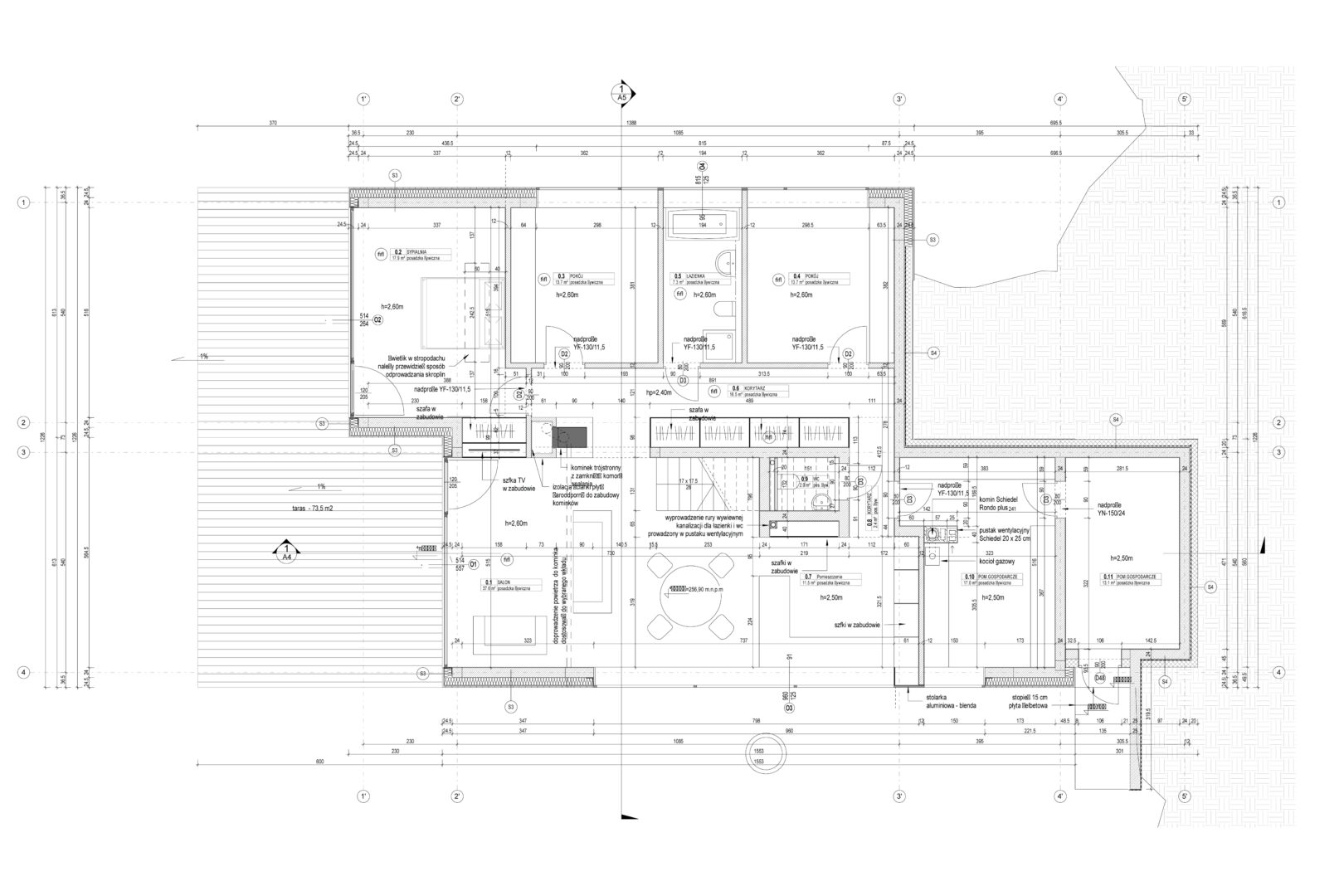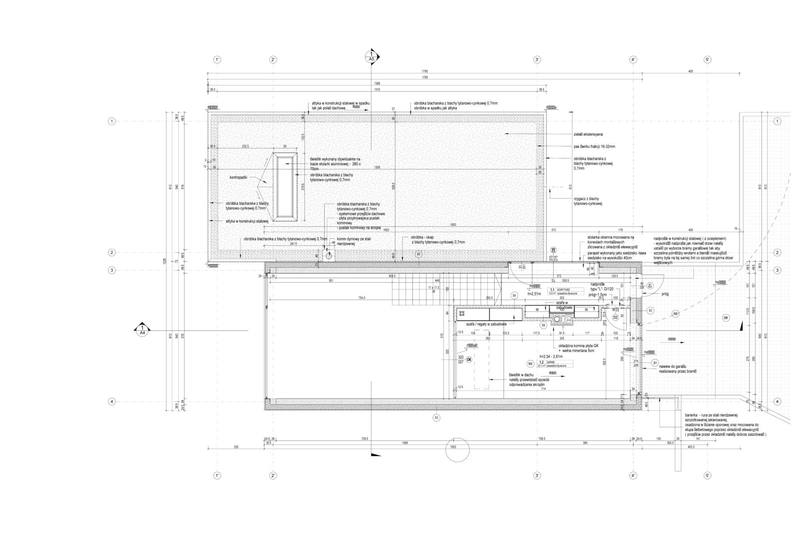 Dom zaprojektowano na niekarczowanej od lat, stromej działce na skraju osiedla domów jednorodzinnych w Rybniku. Obiekt usytuowano tak by zminimalizować wycinkę drzew. Duża różnica poziomów terenu pozwoliła na zaprojektowaniu niestandarowego układu funkcjonalnego, w którym garaż przybrał formę antresoli z wyeksponowanym na pokój dzienny motocyklem.