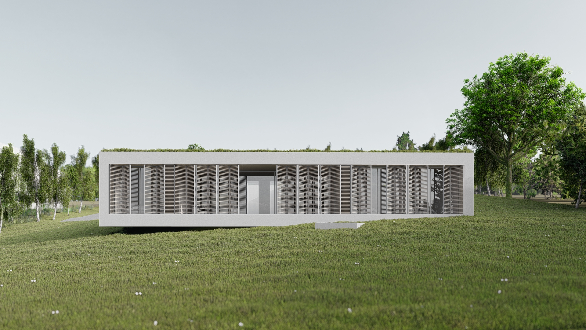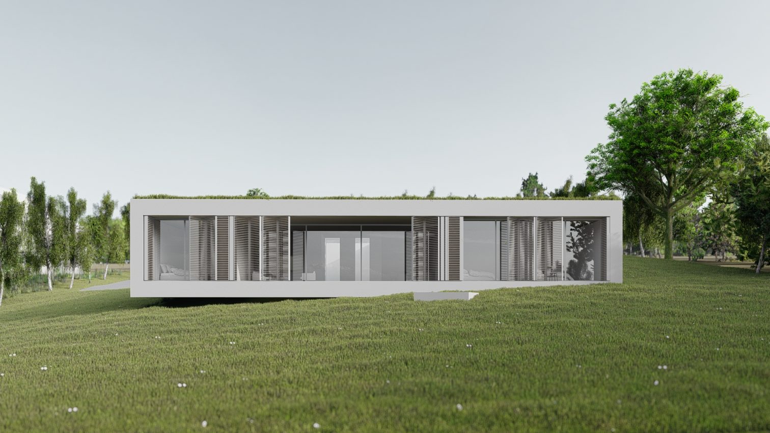 Jedna strona domu jest przezroczysta i otwarta na widok.