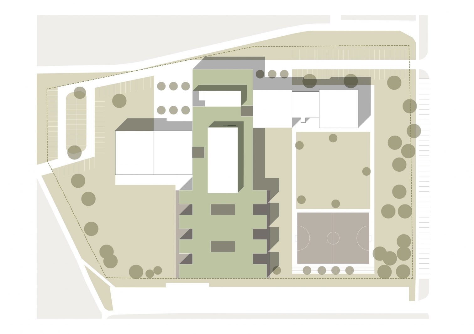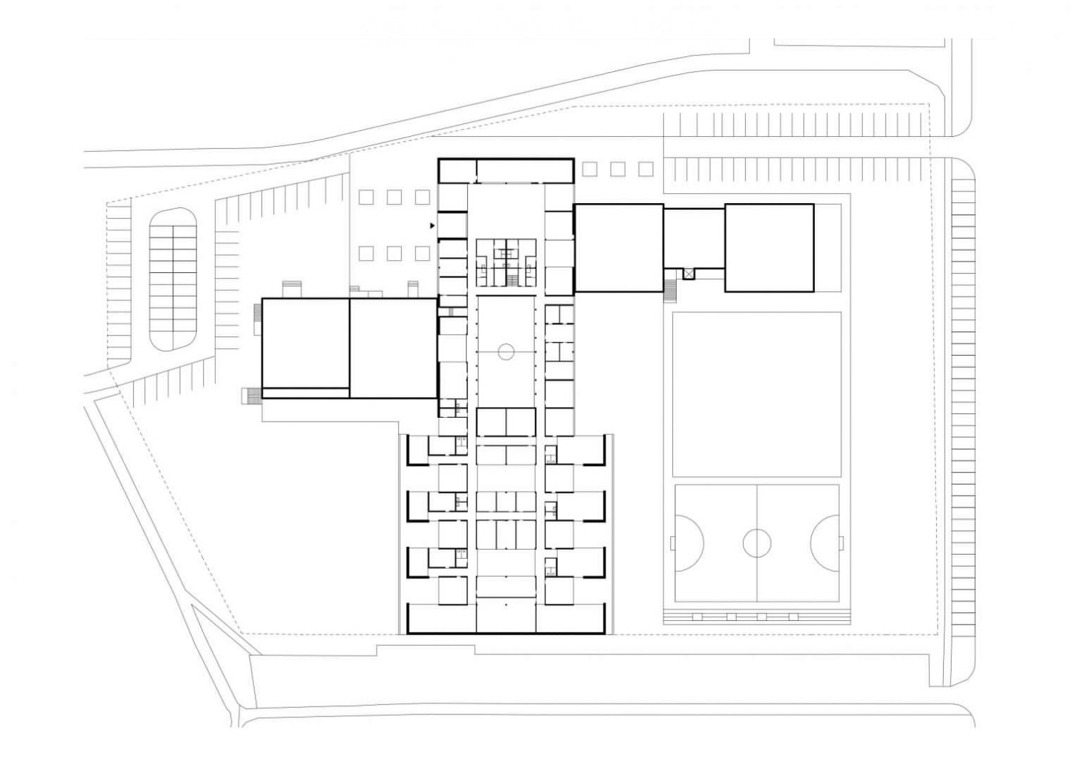 Pomysł stworzenia bryły, będącej łącznikiem, pozwolił na bliskie i praktycznie bezpośrednie połączenie obu istniejących budynków, dodatkowo wyposażając przestrzeń pomiędzy nimi w elementy tworzące część wspólną. W dalszej części znajdują się sale dydaktyczne przedzielone atrium, dzięki którym są dobrze doświetlone, co korzystnie wpływa na rozwój uczniów.
