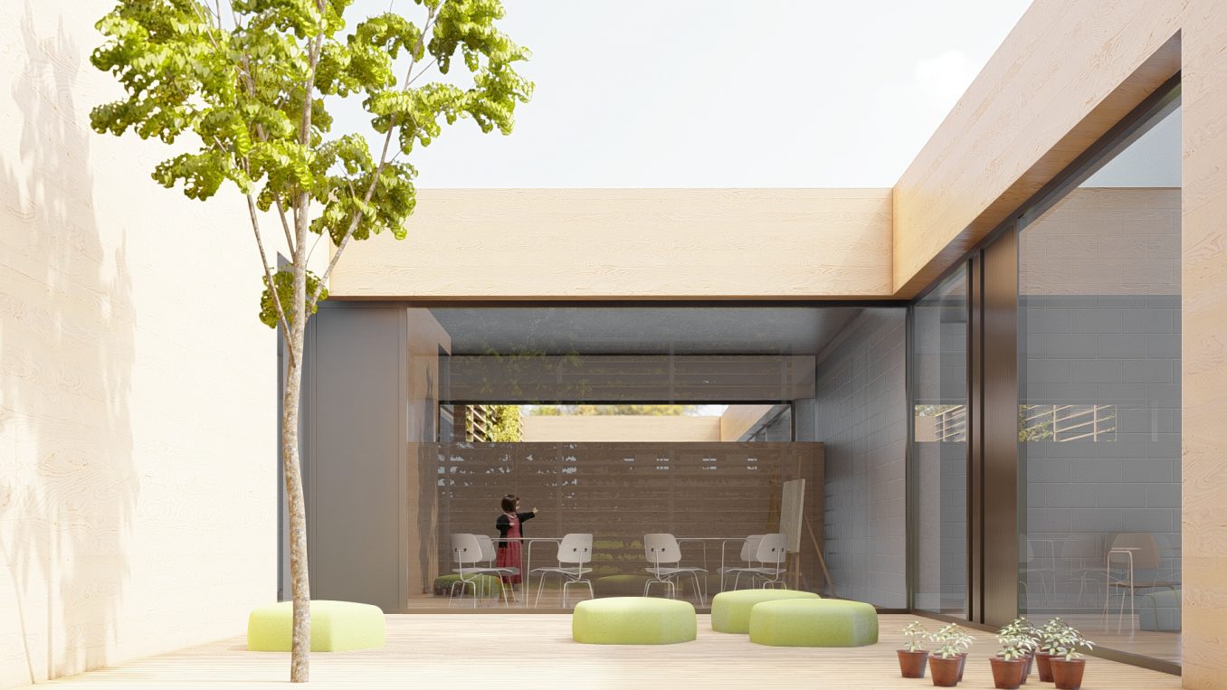 Elementy zieleni w formie wewnętrznych dziedzińców oraz zewnętrznych tarasów, dzielą sale dydaktyczne, doświetlają pomieszczenia oraz pełnią funkcję terapeutyczną, tworząc ogrody sensoryczne, dostępne bezpośrednio z sal, wydzielone indywidualnie dla poszczególnych stref.