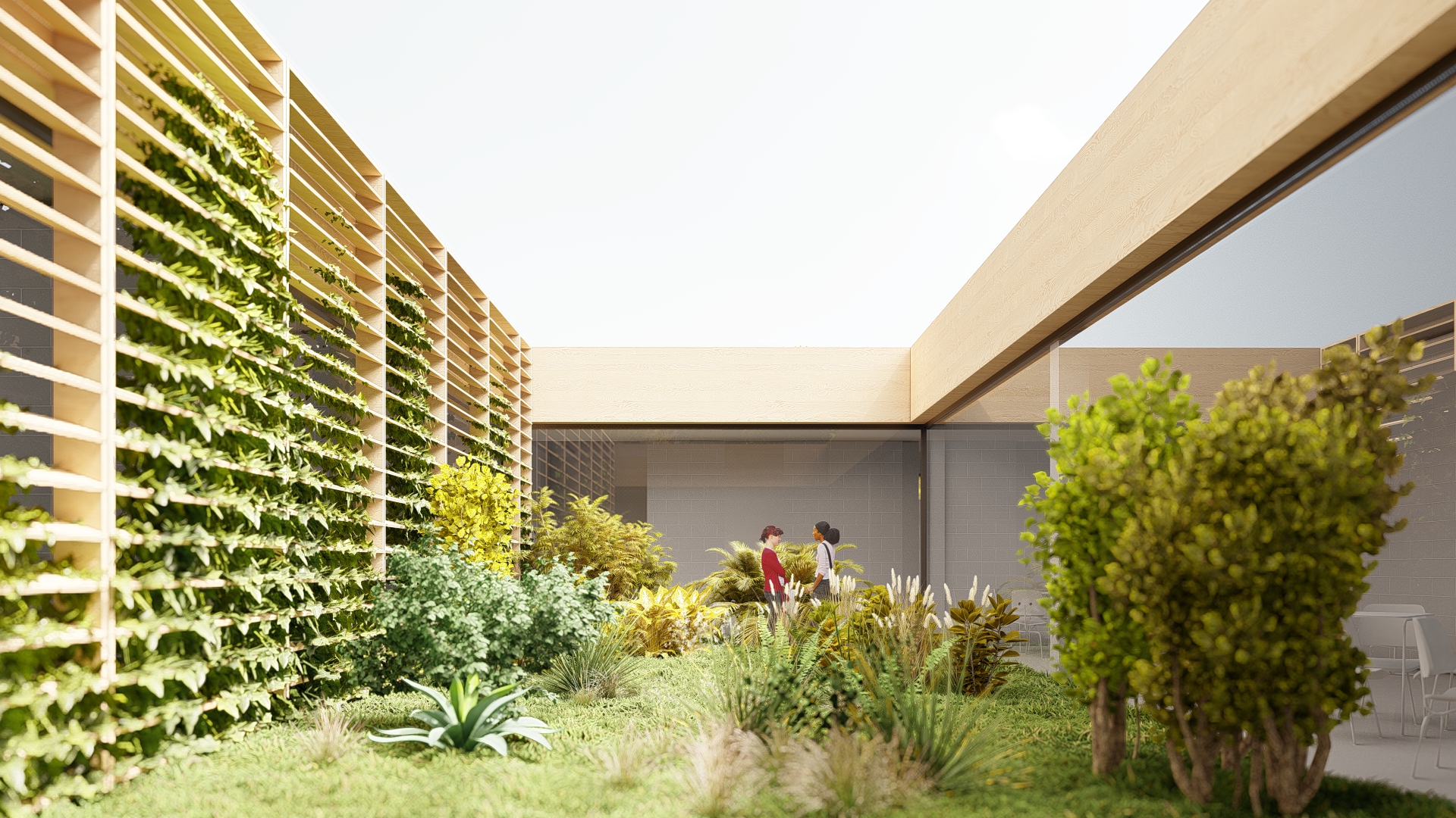Elementy zieleni w formie wewnętrznych dziedzińców oraz zewnętrznych tarasów, dzielą sale dydaktyczne, doświetlają pomieszczenia oraz pełnią funkcję terapeutyczną, tworząc ogrody sensoryczne, dostępne bezpośrednio z sal, wydzielone indywidualnie dla poszczególnych stref.