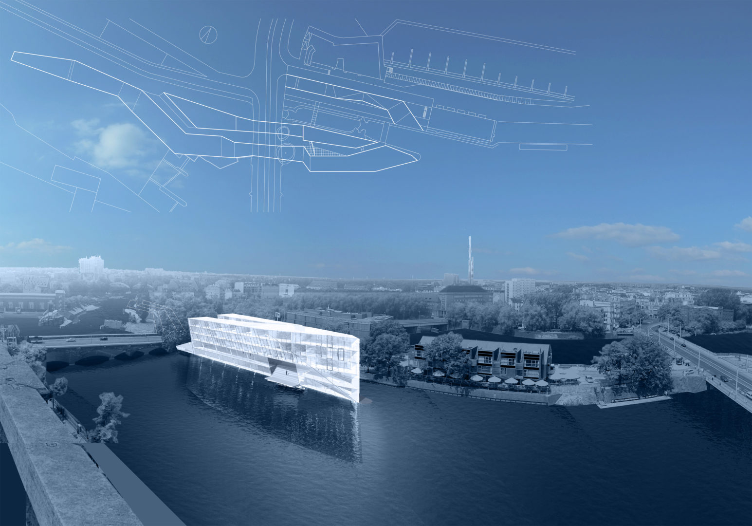 Ideą projektu jest stworzenie pierwszego we Wrocławiu wyrastającego z Odry budynku użytkowego, dającego poczucie pełnego kontaktu z wodą. Proponujemy architekturę będącą zapowiedzią nowego stylu życia nad rzeką i sposobu użytkowania jej brzegów, a także samego lustra wody.