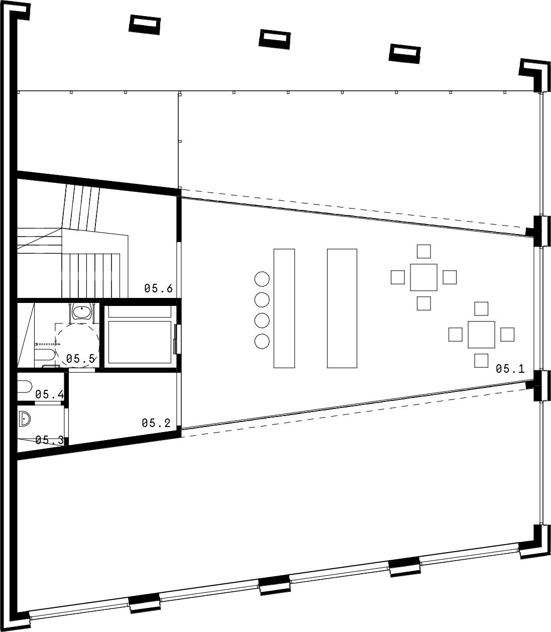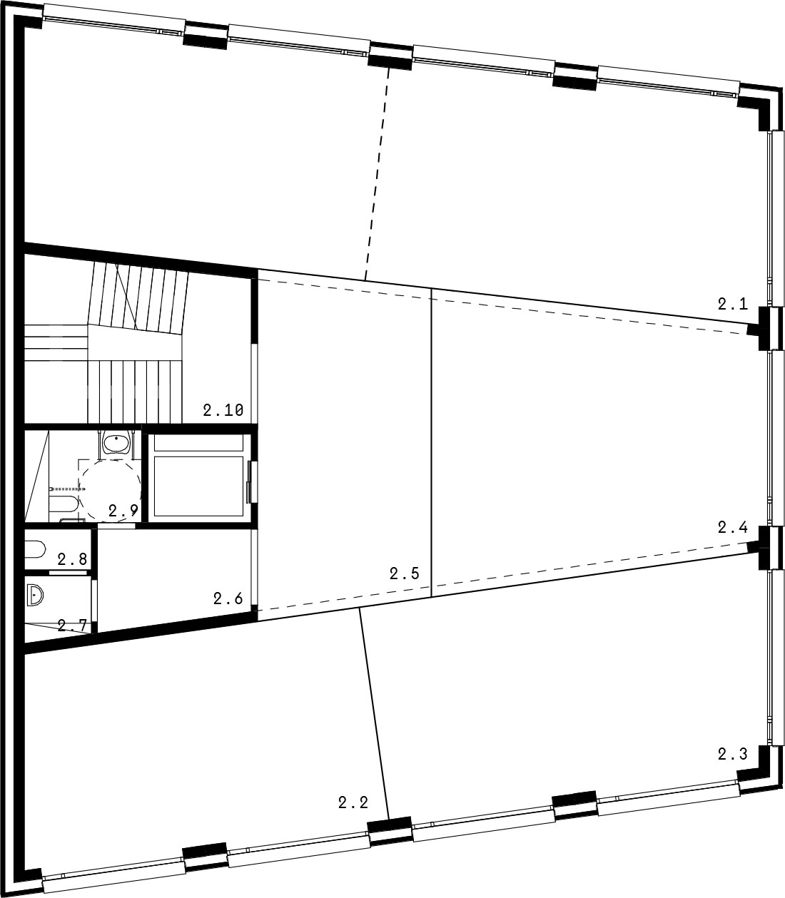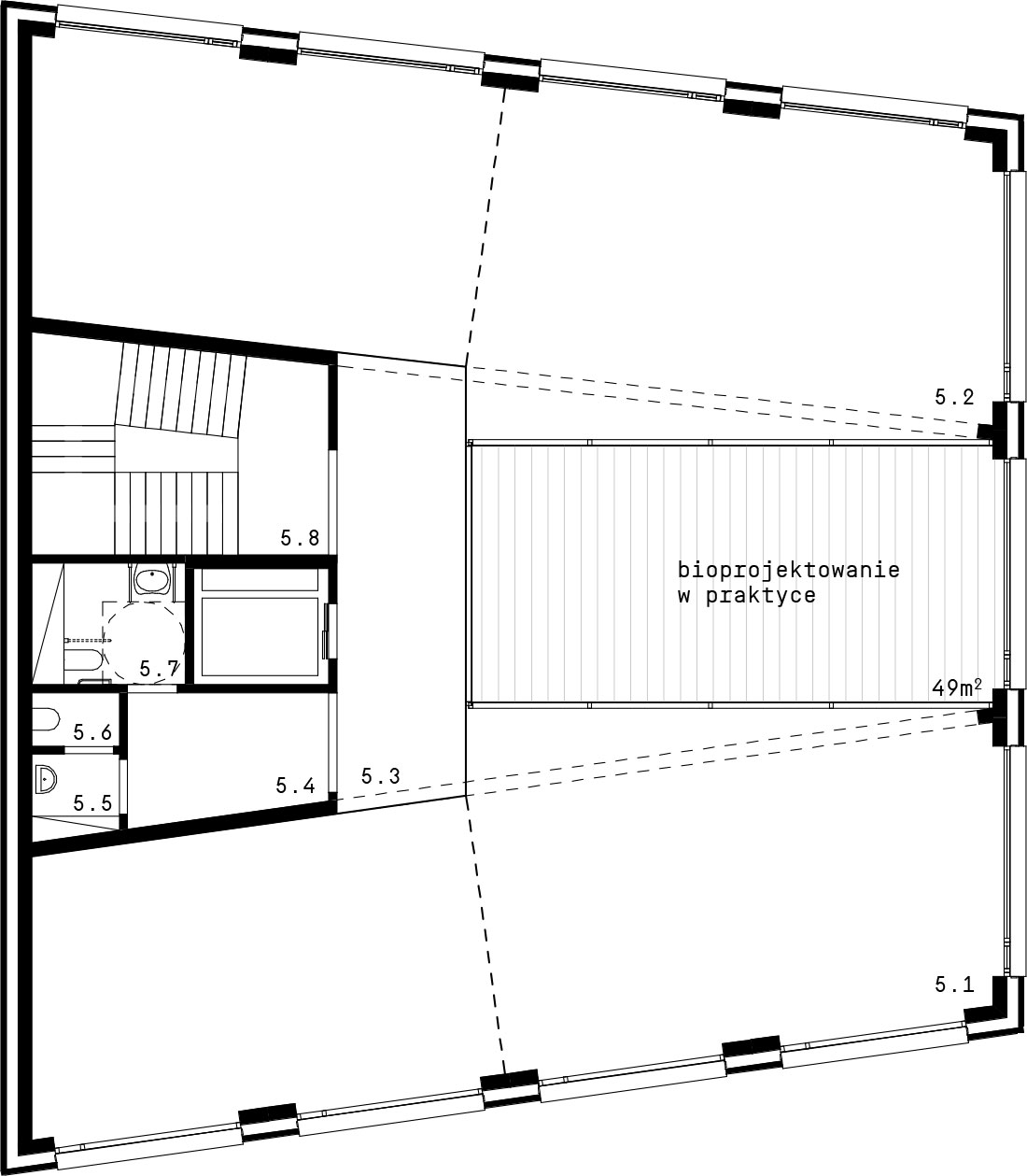 Nieregularny kształt działki zabudowanej niemal do granic prawnych wymusza romboidalny obrys rzutu budynku. Zachodnia ściana stojąca na granicy działki przewidziana do przylegania przyszłej zabudowy plombowej pozostaje ślepa. Na pozostałych elewacjach zastosowano regularny rytm otworów: 6 kolumn w 4 rzędach na elewacji północnej i południowej oraz 3 kolumny w 6 rzędach od wschodu. Wysokość parteru jest prawie dwukrotnie większa niż wysokość pozostałych kondygnacji. Część podziemną stanowi dwukondygnacyjna, sztywna skrzynia żelbetowa. Część nadziemna zaprojektowana została w technologii prefabrykowanej z wykorzystaniem sprężonych belek rozpartych pomiędzy ścianami trzonu komunikacyjnego a zewnętrzną ścianą wschodnią . To rozwiązanie pozostawia kondygnacje nadziemne bez jakichkolwiek wewnętrznych podpór i umożliwia dowolną aranżację przestrzeni pięter – od w pełni otwartej do podzielonej na mniejsze pomieszczenia. Ściany zewnętrzne to szkielet żelbetowy pokryty ociepleniem i stolarką, a skórę budynku zaprojektowano z cegły rozbiórkowej z fugą zacieraną coraz intensywniej ku górze.