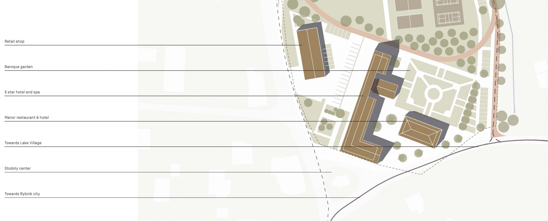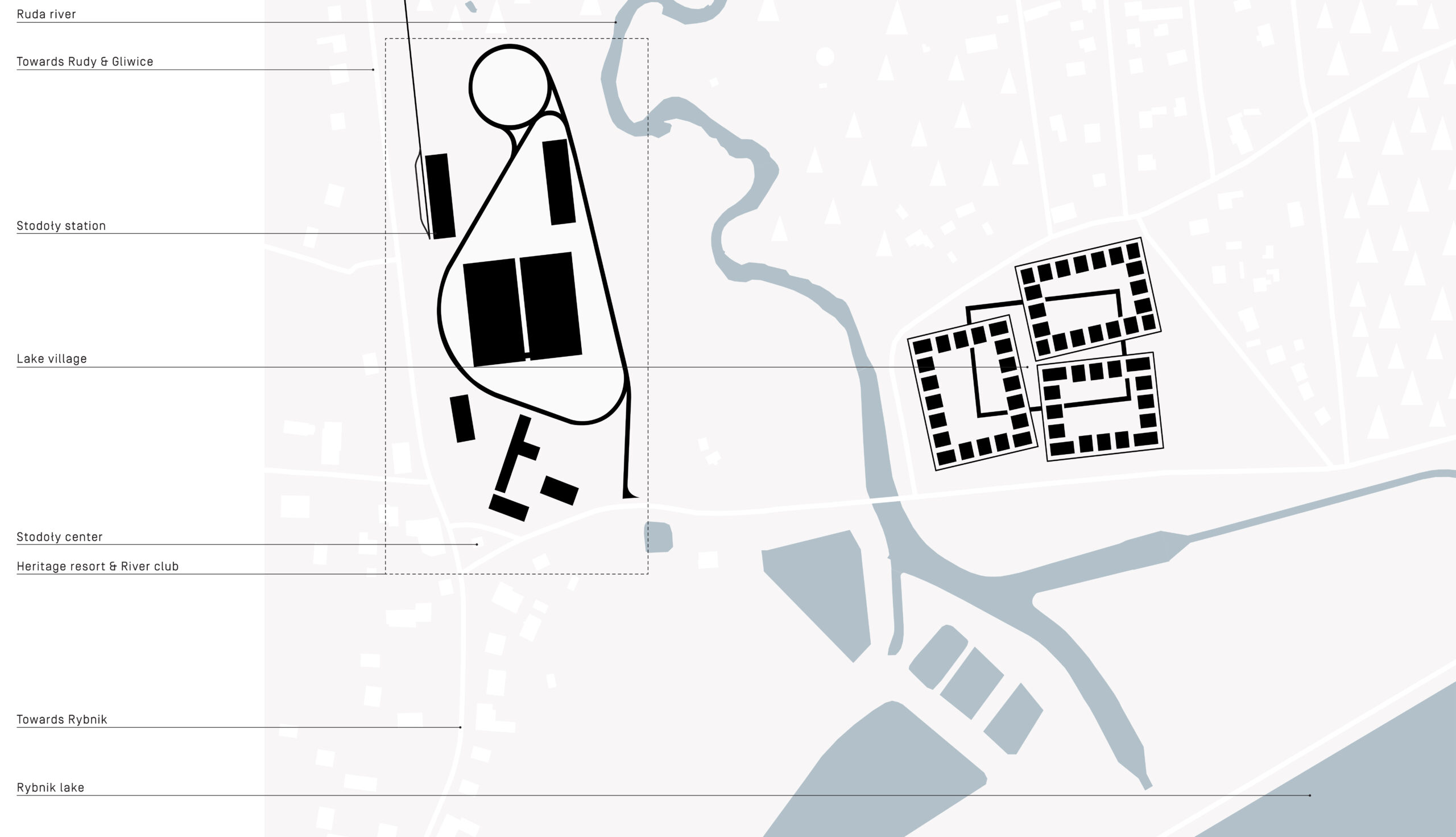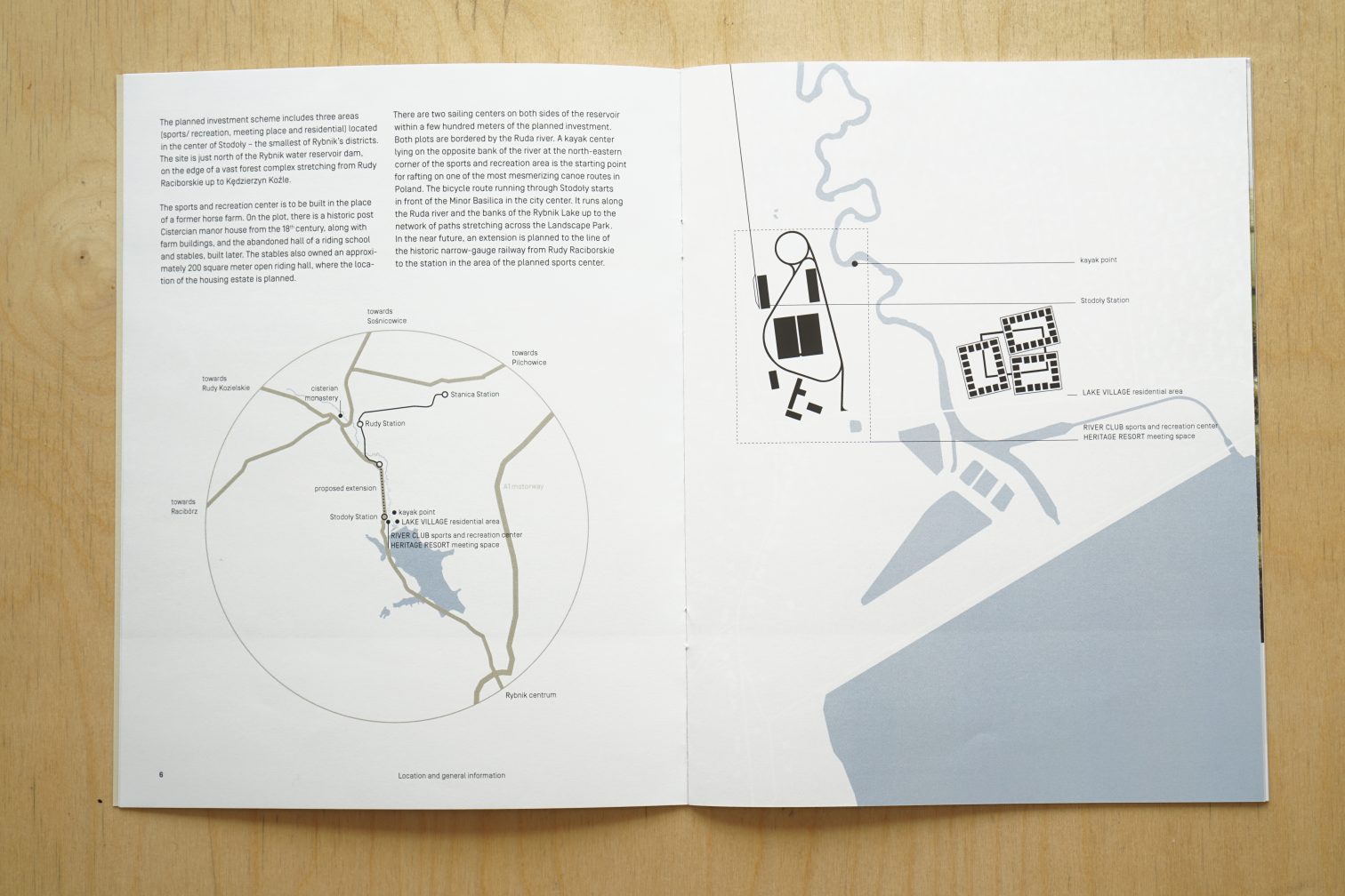 Planowany program inwestycyjny obejmuje trzy obszary (sport / rekreacja, miejsce spotkań i osiedle mieszkaniowe) w centrum Stodoły – najmniejszej z dzielnic Rybnika. Na działce znajduje się zabytkowy pocysterski dwór z XVIII wieku, wraz z zabudowaniami gospodarczymi i opuszczoną ujeżdżalnią oraz stajniami zbudowanymi później. Po obu stronach zbiornika znajdują się dwa ośrodki żeglarskie w promieniu kilkuset metrów od planowanej inwestycji. Obie działki graniczą z rzeką Rudą.