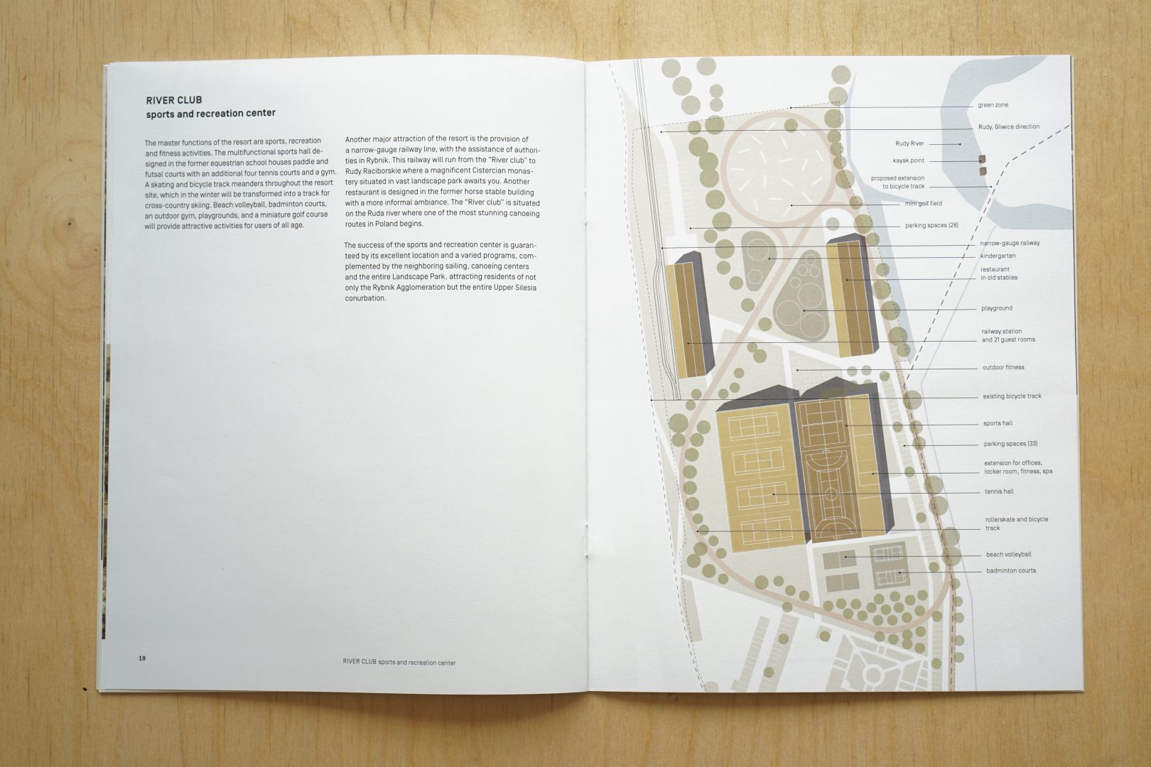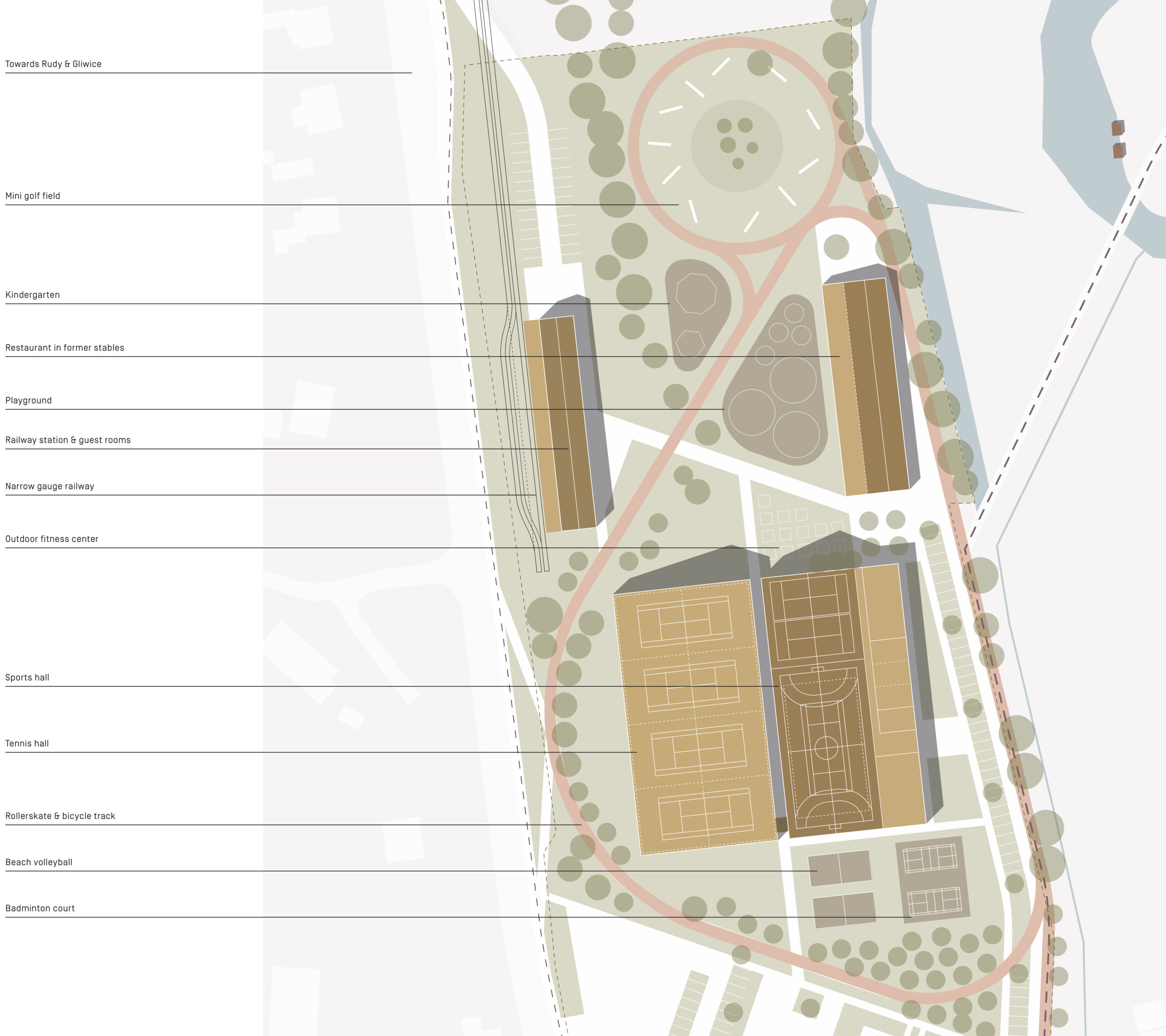 Głównymi funkcjami ośrodka są zajęcia sportowe, rekreacyjne i fitness. Znajduje się tam wielofunkcyjne boisko sportowe oraz siłownia. Na terenie całego ośrodka poprowadzona została trasa rowerowa, która w okresie zimowym będzie przekształcana w tor do narciarstwa biegowego. Boiska do siatkówki plażowej oraz badmintona, siłownia na świeżym powietrzu, place zabaw i pole do minigolfa zapewnią atrakcyjne atrakcje dla osób w każdym wieku. Kolejną dużą atrakcją jest kolejka wąskotorowa. Linia kolejki biegnie od terenu klubu do Rud Raciborskich, gdzie znajduje się wspaniały klasztor cysterski w rozległym parku krajobrazowym.