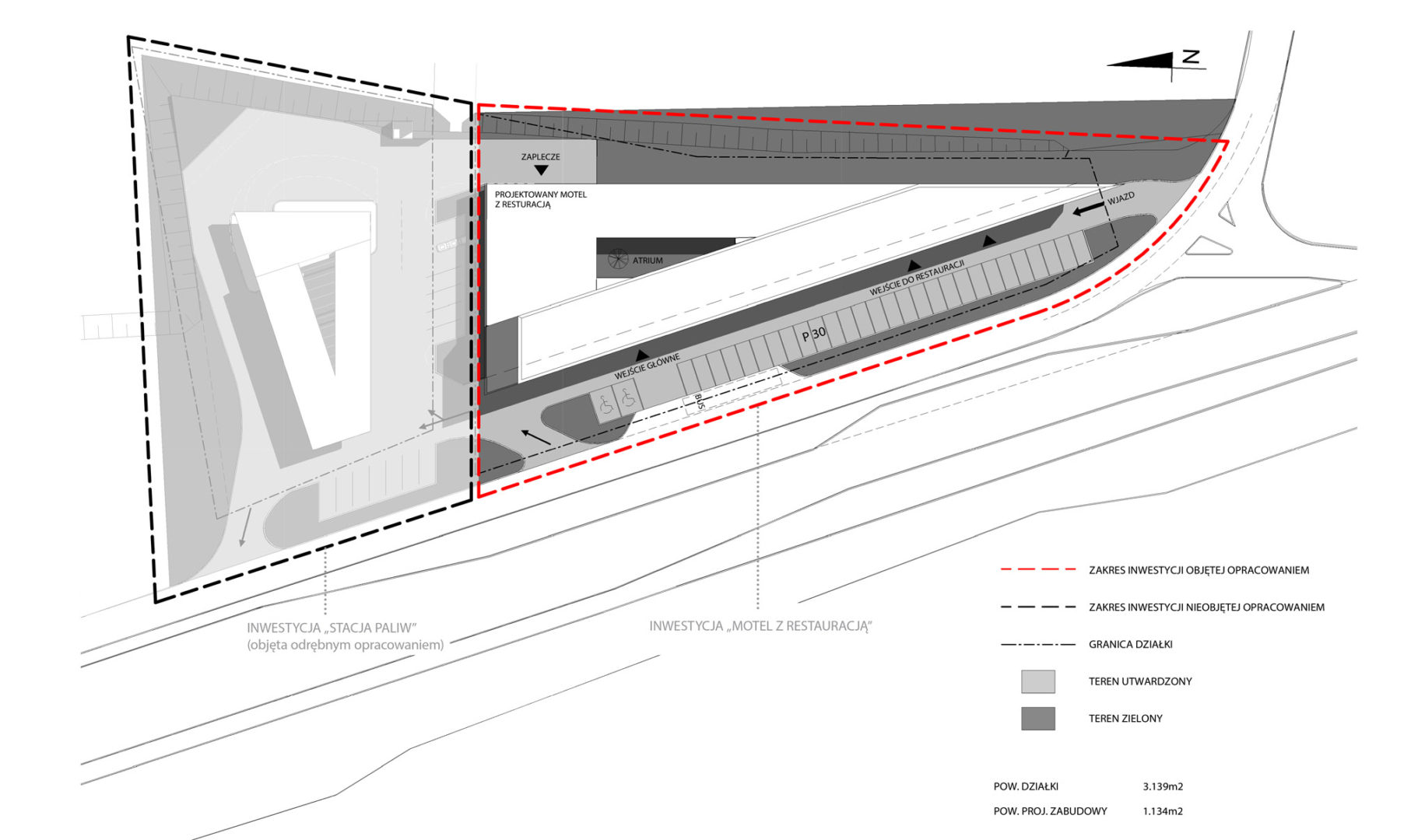 Na terenie stacji paliw znajdować się będą 2 wysepki z dystrybutorami dwustronnymi, w tym 1 z LPG oraz1 dystrybutor przystosowany do obsługi samochodów ciężarowych. Zaprojektowano także budynek obsługi stacji z kasami, sklepem i zapleczem dla obsługi oraz myjnię bezdotykowa przylegającą do budynku.W projekcie przedstawiono 2 warianty budynku obsługi stacji, różniące się powierzchnią pomieszczenia obsługi klienta. Na parterze będzie znajdować się hall wejściowy z recepcją, bar i restauracja wraz zapleczem, sala wielofunkcyjna,pomieszczenia administracji, pralnia i toalety ogólnodostępne. Hall, bar, restauracja i sala wielofunkcyjna otwierają się na niezadaszone, zielone atrium. Na 2 kolejnych kondygnacjach projektuje się pokoje motelowe (razem 33 pokoje 2-osób z łazienkami).