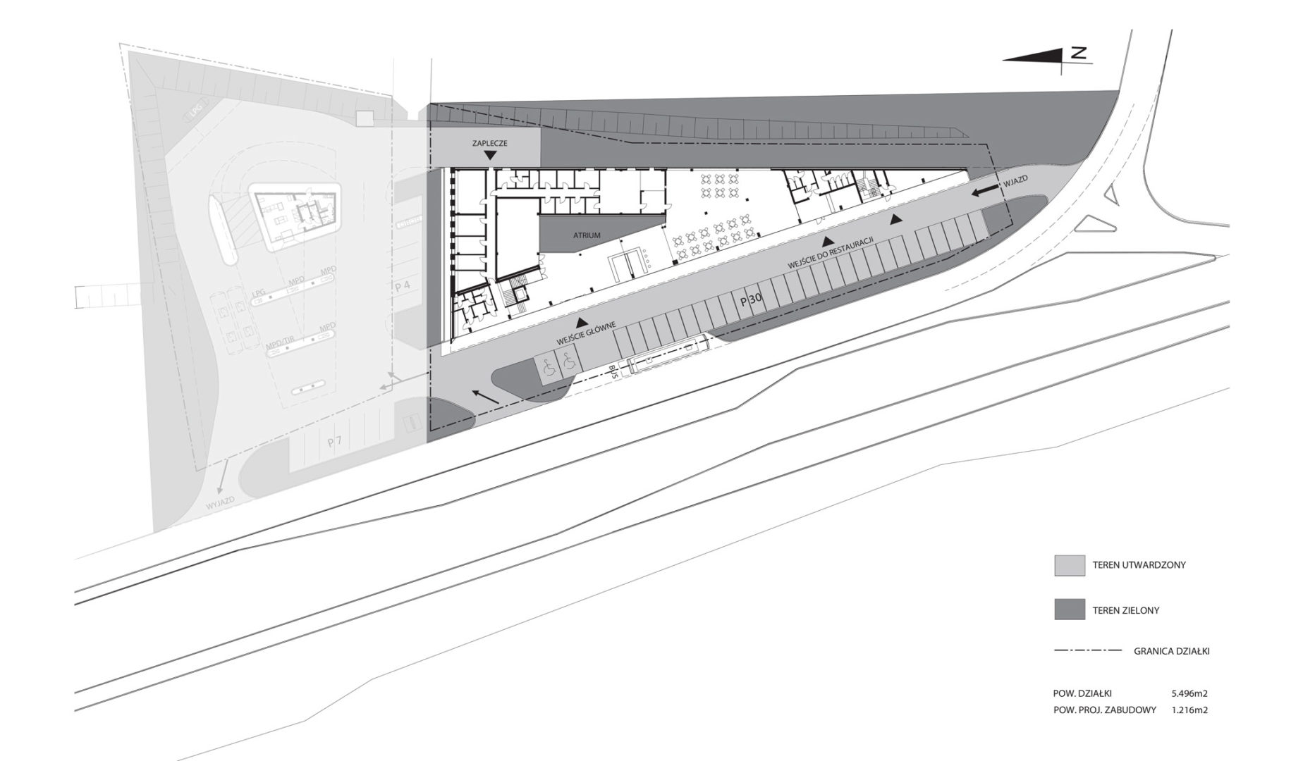 Projektowany motel z restauracją wraz z planowaną na działce od strony północnej stacją paliw stanowią Kompleks Obsługi Podróżnych i objęte są wspólnym projektem zagospodarowania terenu. Budynek motelu został zlokalizowany w centralnej części działki. Część motelowa budynku jest 3-kondygnacyjna, pozostała część – parterowa. Zaprojektowano 2 wjazdy na działkę od drogi stanowiącej zjazd z ul. Kościuszki, jeden w południowym krańcu działki, drugi – przy północnym. Wzdłuż granicy zachodniej projektuje się strefę parkingową, przewiduje się 30 miejsc postojowych, w tym 2 dla osób niepełnosprawnych. Przewidziano także stanowisko postojowe dla autokaru wzdłuż parkingu od strony drogi. Zaprojektowano 2 wejścia do budynku od strony parkingu, 1 wejście od strony wschodniej dla pracowników i dostaw. Tereny projektowanego motelu i sąsiedniej stacji paliw zostaną połączone poprzez zabudowany ciek wodny.