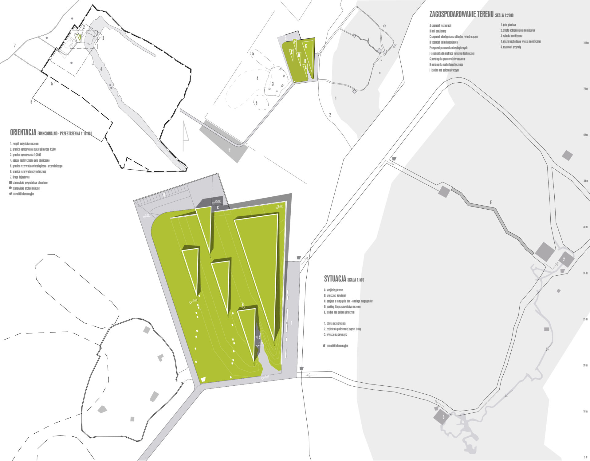 Znaki pozostawione na ścianach wyrobisk i inne świadectwa kultury materialnej pochodzące z okresu neolitu mają w sobie niezwykłą pierwotną wrażliwość. W swojej prostocie wydają się być zaskakująco współczesne w wyrazie. Koncepcja muzeum stanowi próbę przekazania tego niezwykłego napięcia. Bezpośrednią inspiracją były megalityczne zespoły budowli, jakimi były grobowce kujawskie pochodzące z okresu eksploatacji kopalni neolitycznych na terenie Krzemionek. Założenia te są w krajobrazie znakami, sygnałami ukrytej wewnątrz wartości. Takim samym znakiem ma być przedstawiona koncepcja muzeum. Funkcja ulokowana jest na 2 kondygnacjach. Z części podziemnej ponad powierzchnię gruntu wyłania się 5 brył zakomponowanych na pochyłym nasypie. Na tym poziomie mieszczą się funkcje wymagające doświetlenia, takie jak biura, pracownie archeologiczne, kawiarnia. Zasadnicza część założenia mieści się na poziomie -1.30 m, tam też znajdują się hall, sale wystawowe, edukacyjne, konferencyjne oraz archiwum.