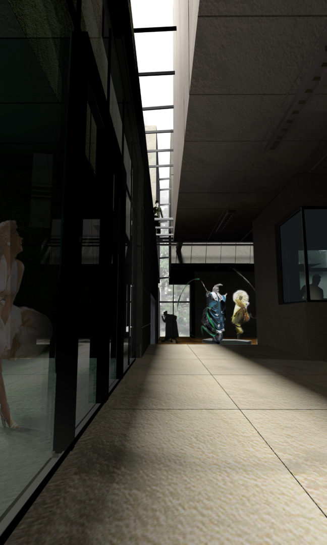 Zmodernizowany istniejący budynek stanowi strefę drugą. Parter to foyer dla trzech sal teatralnych – dwóch istniejących i nowej kameralnej – z kasą, bufetem, szatniami dla widzów i sanitariatami. W części północnej mieści się dział promocji i inne biura odpowiedzialne za funkcjonowanie obiektu. Na piętrze zlokalizowane zostały pomieszczenia administracji uczelni, sala konferencyjna i dwupoziomowa biblioteka z czytelnią.