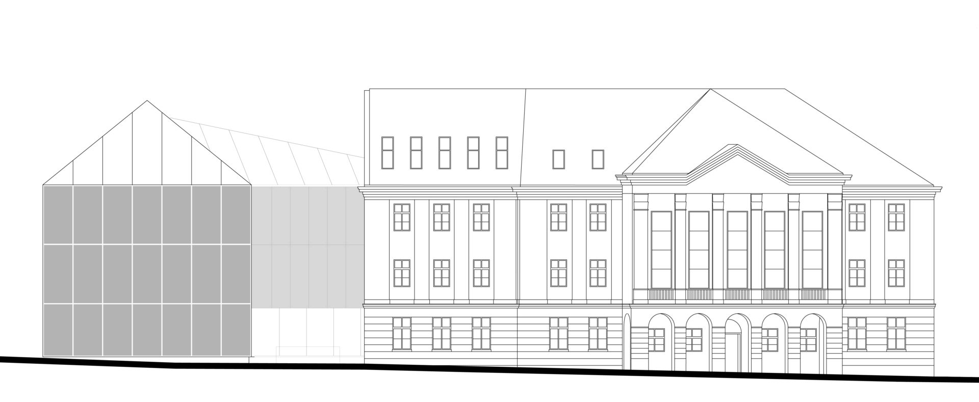 Jedno skrzydło rozbudowy z dachem dwuspadowym, stanowi kontynuację formalną dla wcześniejszego obiektu, drugie od południa prezentuje współczesna prostą formę z przewieszoną bryłą sali obrad, na wyższej kondygnacji.
