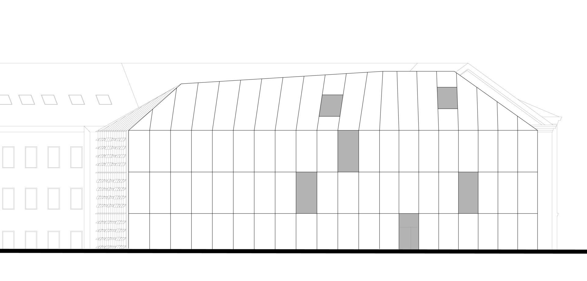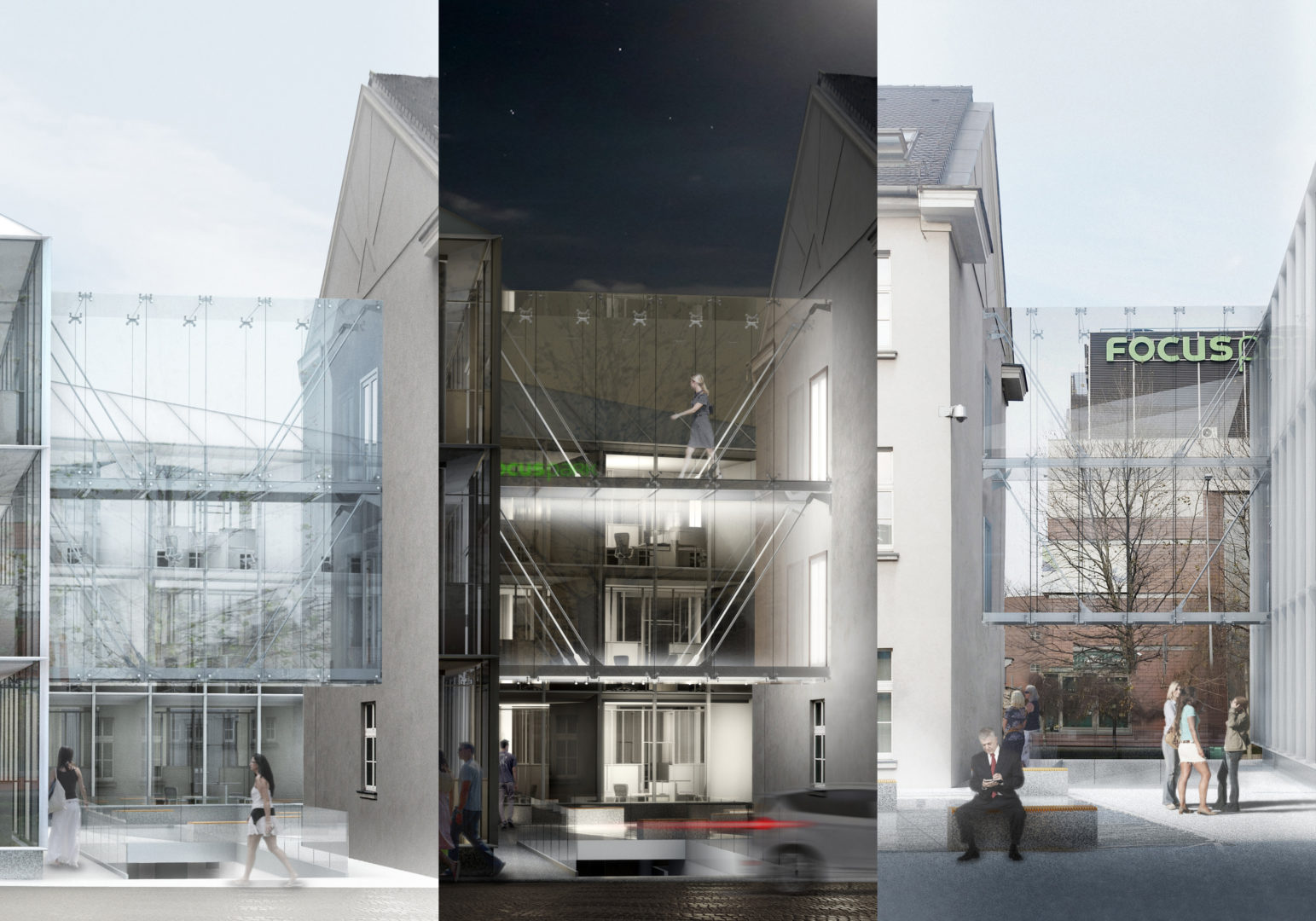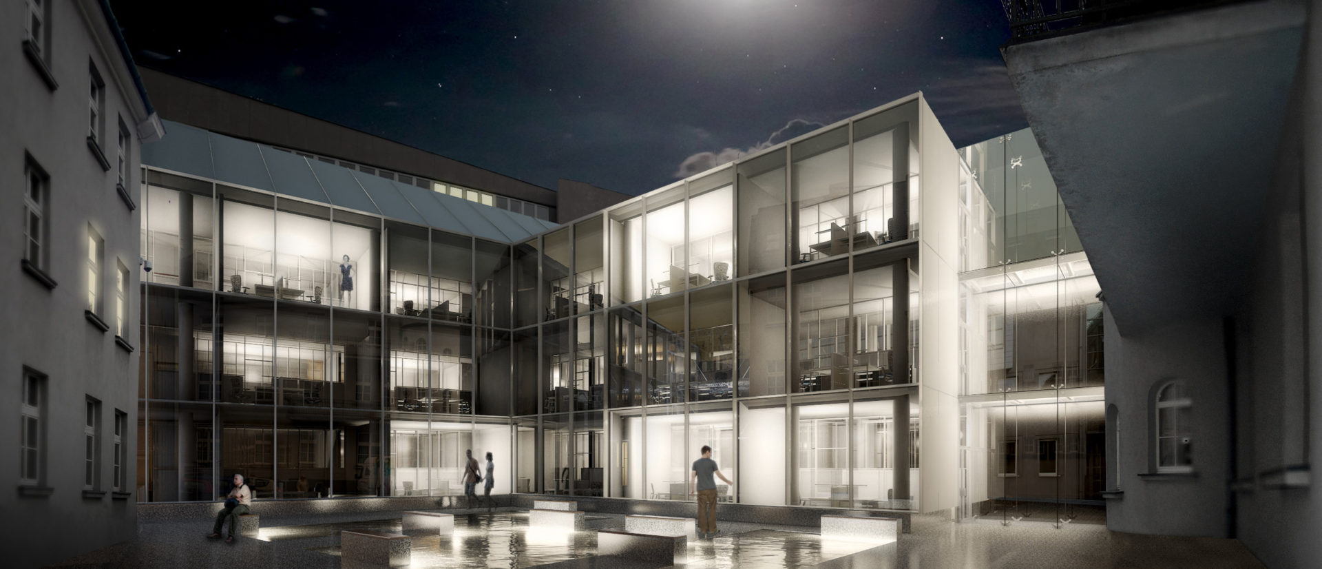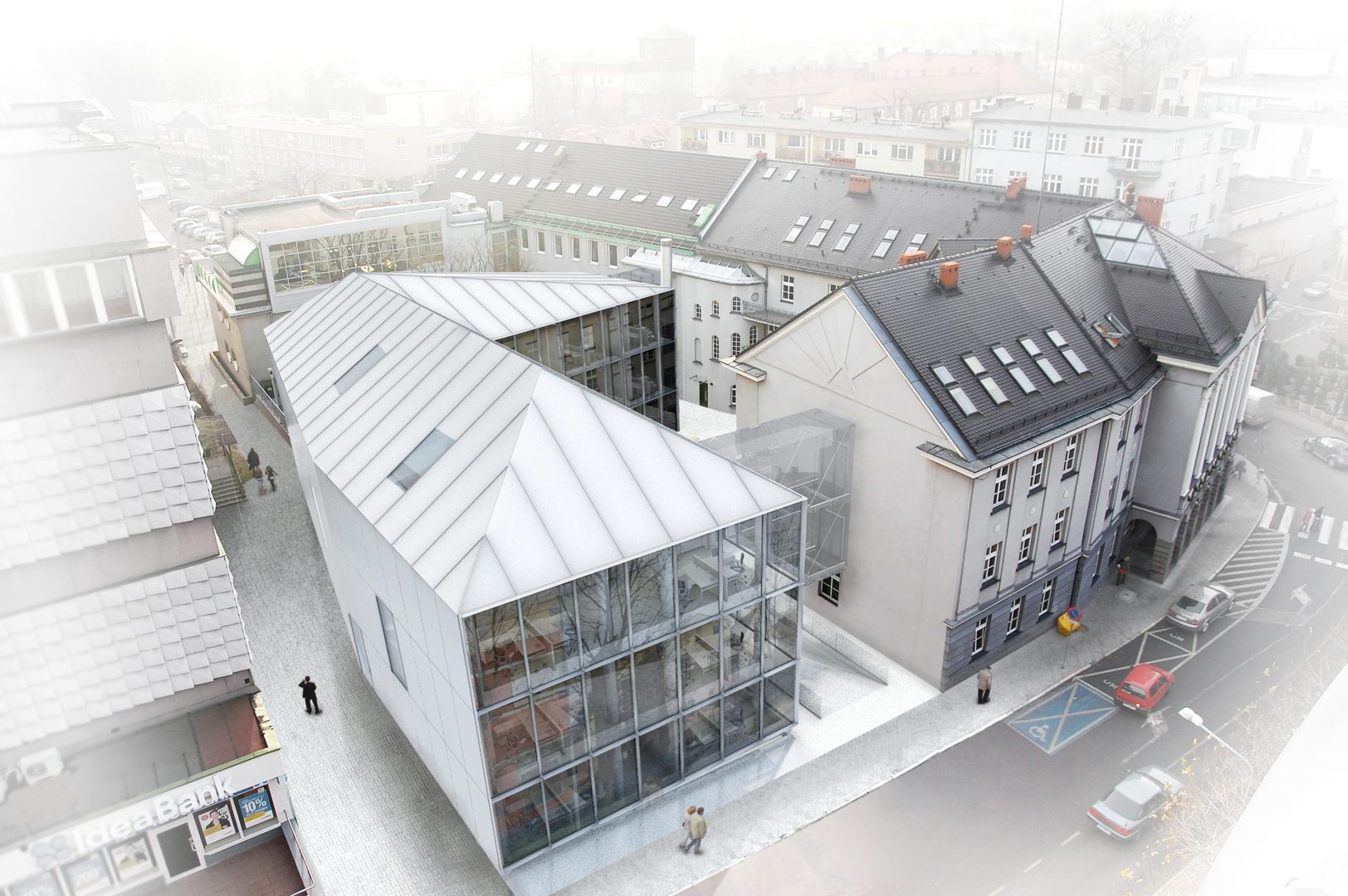Nowy obiekt na rzucie w kształcie lustrzanego odbicia litery „L”, usytuowany w północnej części wewnętrznego dziedzińca urzędu. Nowa kubatura w połączeniu z najstarszym budynkiem istniejącym, stworzą układ zamknięty z wewnętrznym placem – dziedzińcem, stanowiącym miejsce relaksu i odpoczynku dla petentów jak również przechodniów.