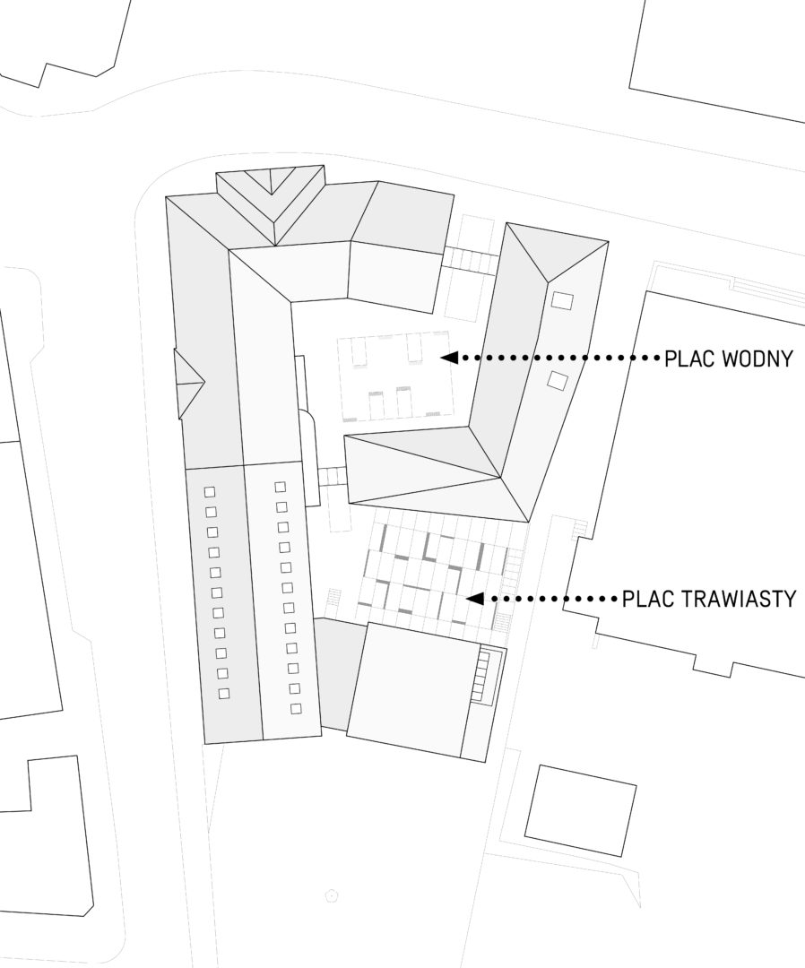 Dziedziniec położony na poziomie 0,00m, dostępny jest bezpośrednio z parteru urzędu jak również z poziomu chodnika od ulicy Chrobrego.