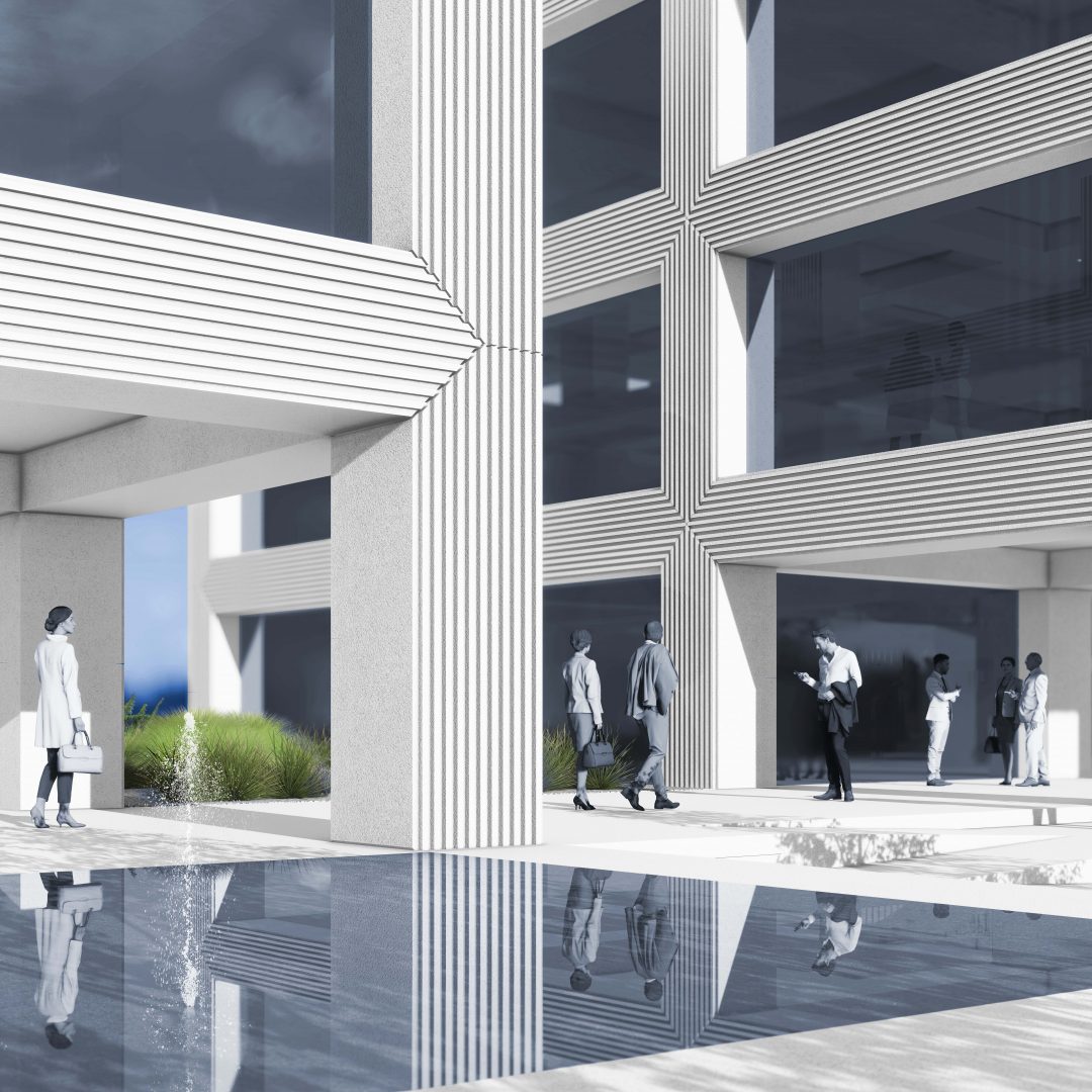 Siatka konstrukcyjna obu budynków częściowo się pokrywa, a oba główne wejścia i podcienia przed nimi znajdują się na jednej linii. Ten kierunek powtarzają linie schodów zewnętrznych i ramp na froncie. Powierzchnie tarasu między schodami są wykorzystane jako małe fontanny typu „mokry chodnik”. Prócz funkcji dekoracyjnych ochładzają one podcienia służące jako strefa wejścia, oczekiwania i relaksu. Ogród z traw ozdobnych między budynkami również zapewnia miejsce do odpoczynku. Przed tarasem ze schodami zewnętrznymi zaprojektowano płac, który szerokimi przejściami łączy się z ulicami otaczającymi działkę. Płac jest wizualnie oddzielony od parkingu szpalerem drzew. Wewnętrzna droga dzieli parking na dwie mniejsze strefy. Drzewa znajdują się pomiędzy miejscami postojowymi i na obrzeżach, zapewniając cień na utwardzonych powierzchniach. Drzewa są również umieszczone na każdej powierzchni zielonej wokół budynków. Stosunkowo niska wysokość obiektów, rozbicie bryły na powtarzalne ćwiartki, biały kolor elewacji i duża liczba drzew mają stworzyć atmosferę klasycystycznego pałacu w parku.