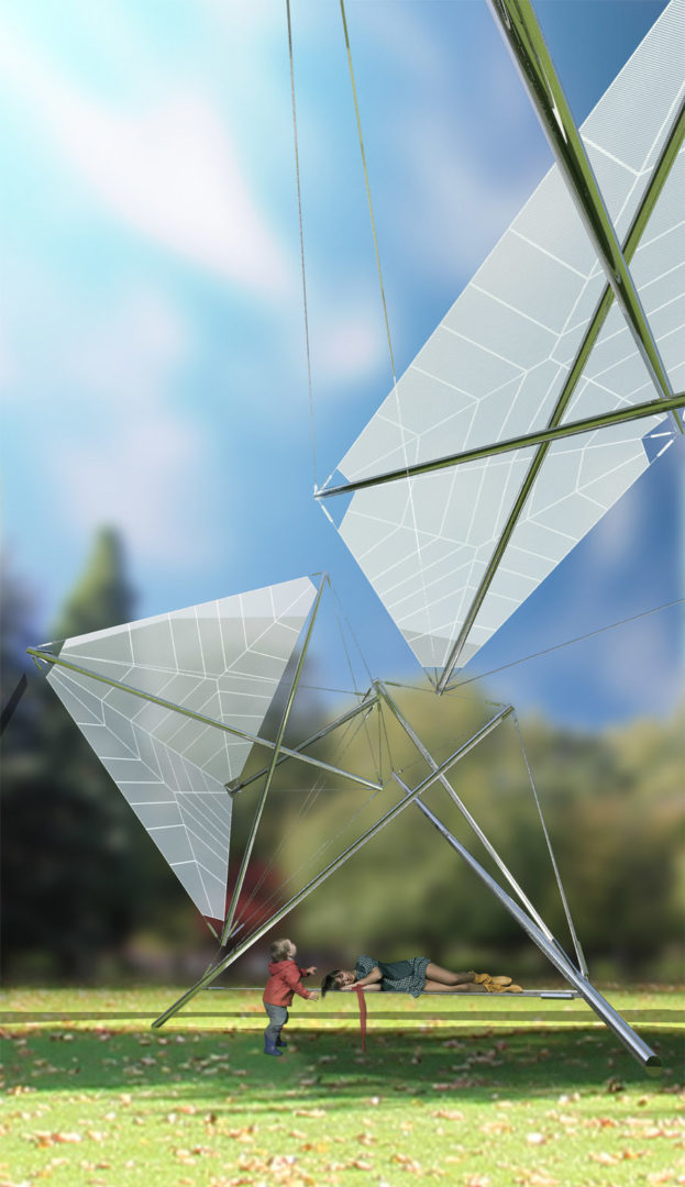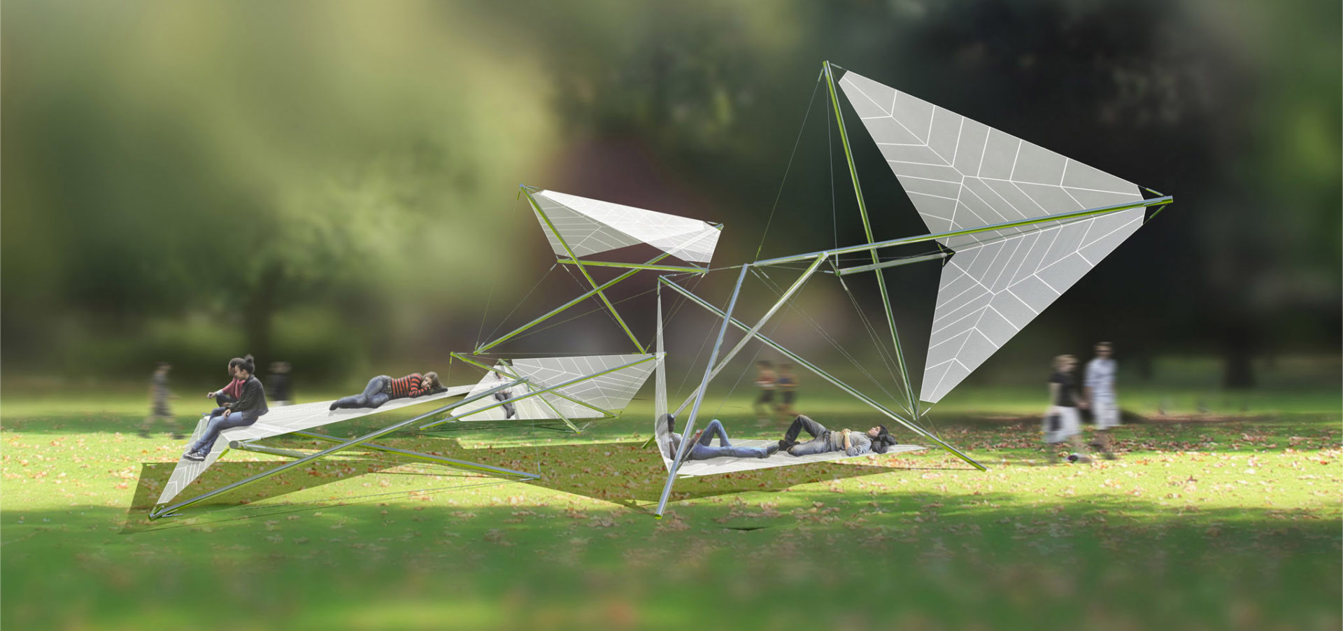 This additive Pavilion structure is freely composed of five tensigrity modules/cells, but it is not difficult to imagine further expansion. Our competition entry consists of fifteen thirteen-foot- long aluminum rods, along with five membranes and steel ties. The membrane consistency limits the distortion of wind and furthermore dematerializes the pavilion object as it blends into its surrounding environment. The rods are finished with simple bolted heads to which the ties are fixed. The bolts located on the ties are used to create tension within the whole system. The ends, that come into contact with the ground, are finished with pins that are firmly screwed into the soil.